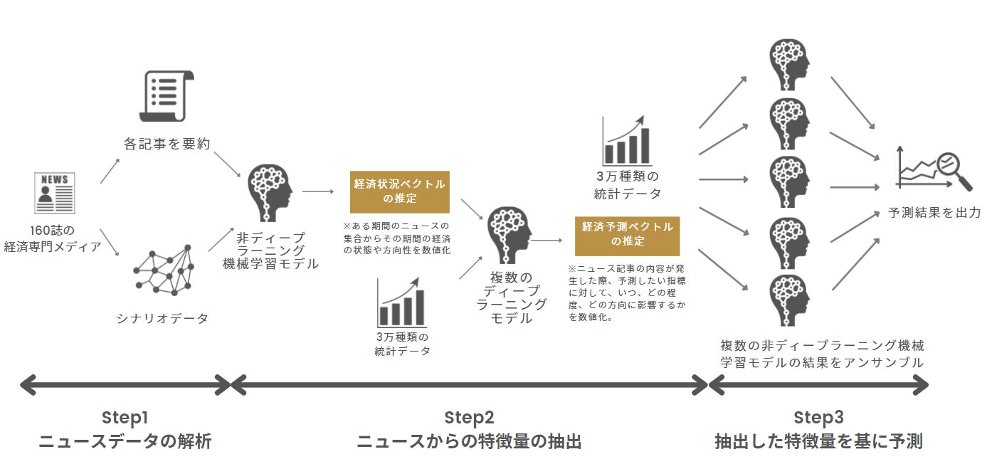 Step1で解析した構造化データから、「経済状況ベクトル」、「経済予測ベクトル」(※2)という2段階の解析で予測対象に対する特徴量の抽出を行います。