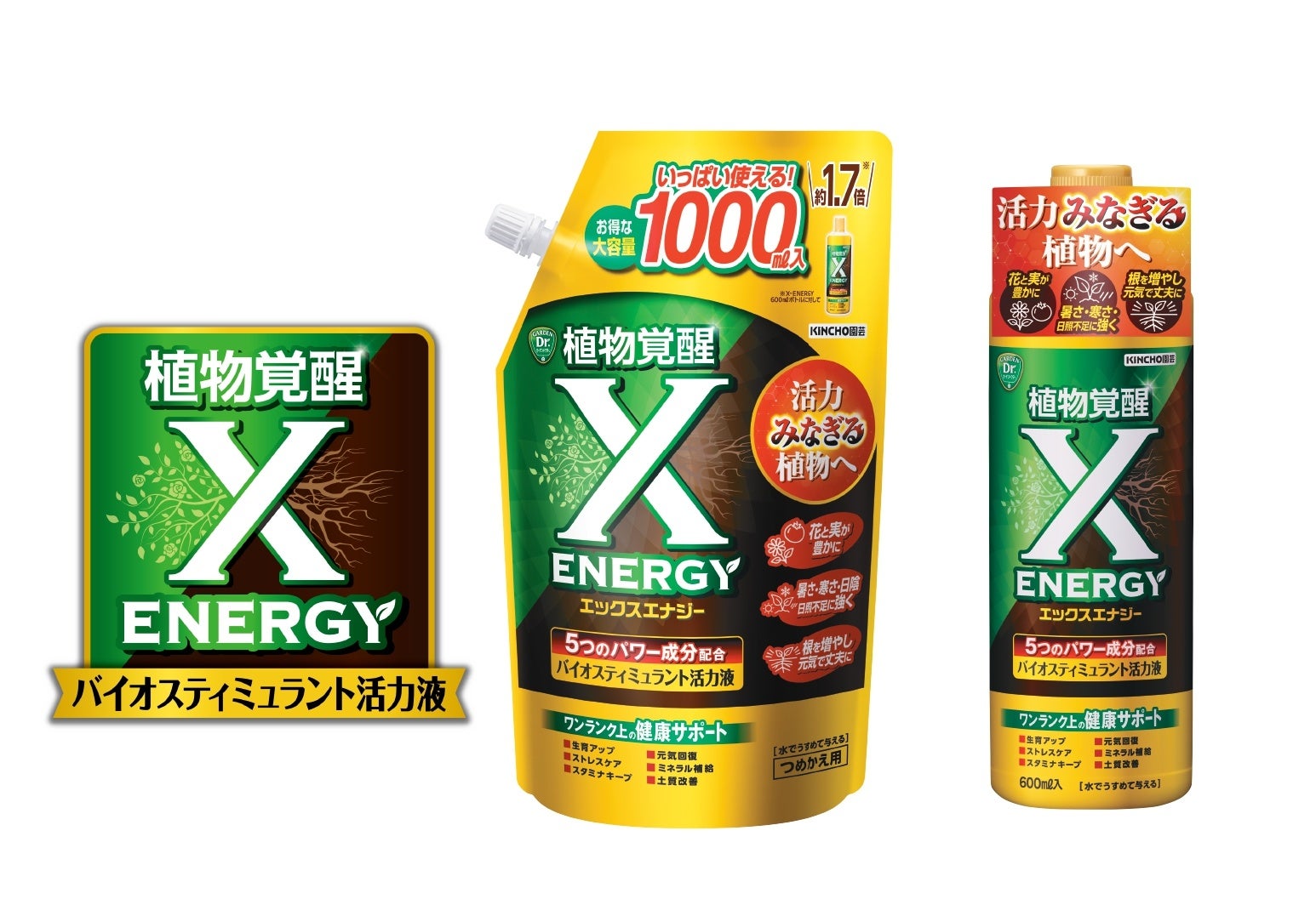 「X-ENERGY」は、水で希釈して植物に与えるだけで、植物の根を刺激し、環境ストレスに負けない健やかな生育をサポートするバイオスティミュラント成分を配合した活力液です。2025年春の発売以来、多くのご愛用者さまからの好評を受け、つめかえ用として本体サイズの約1.7倍の大容量サイズを新たに発売します。