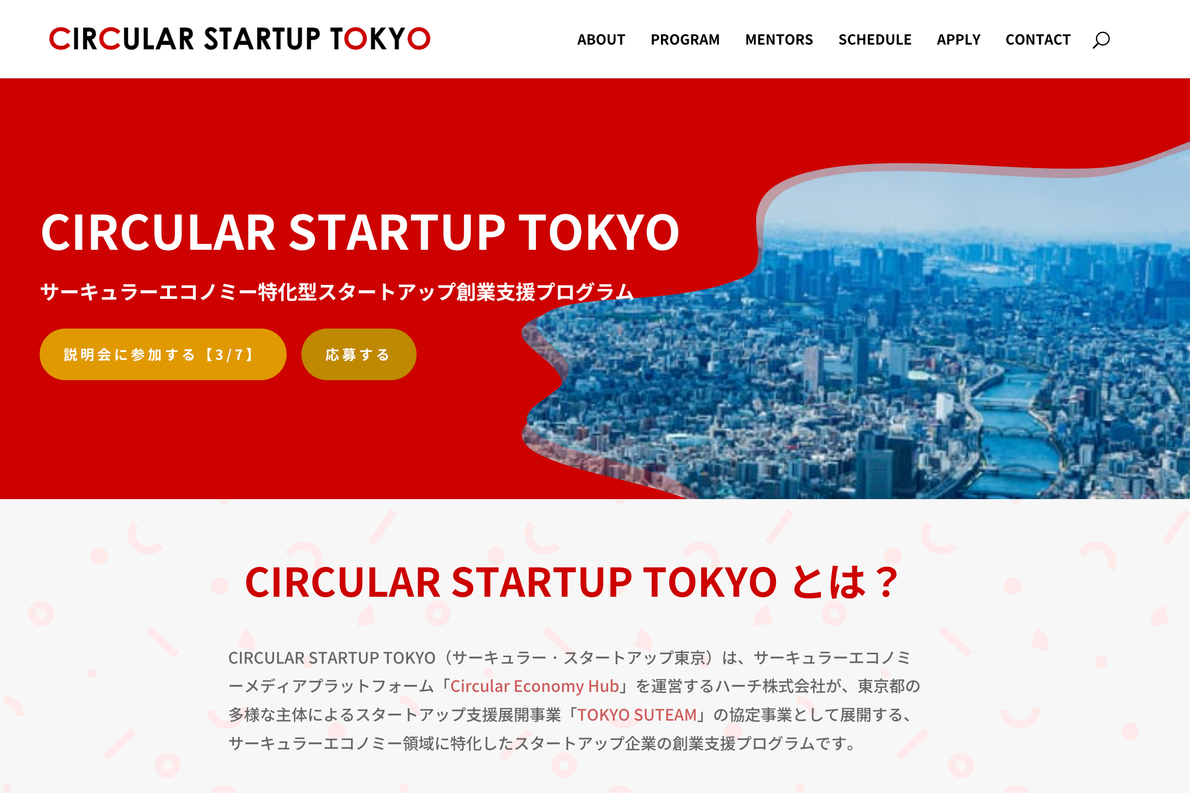 CIRCULAR STARTUP TOKYO(サーキュラー・スタートアップ東京)は、サーキュラーエコノミーメディアプラットフォーム「Circular Economy Hub」を運営するハーチ株式会社が、東京都の多様な主体によるスタートアップ支援展開事業「TOKYO SUTEAM」の協定事業として展開する、サーキュラーエコノミー領域に特化したスタートアップ企業の創業支援プログラムです。