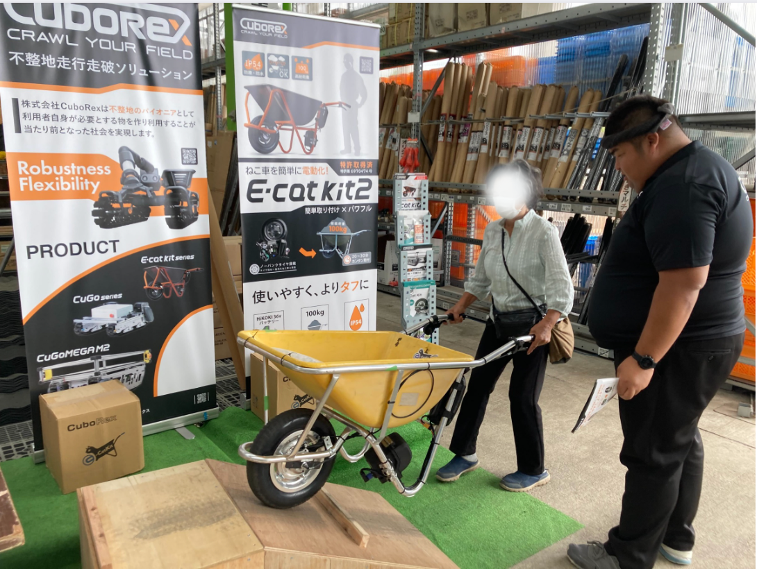 弊社では、これまで「「不整地で使えるガチなレゴ」を作り、不整地産業のあまねく課題へ挑む」というミッションのもと、ねこ車のタイヤを交換するだけで電動化できるキット「E-Cat Kit」を販売してまいりました。累計販売台数は1,000台を超え、和歌山県のみかん農家を中心に全国の農業や建設業において、飼料や収穫物、荷物の運搬での利用を拡大しております。2022年に埼玉県横瀬町で行った実証実験では、運搬労力が1/3になるという結果が実証されています。