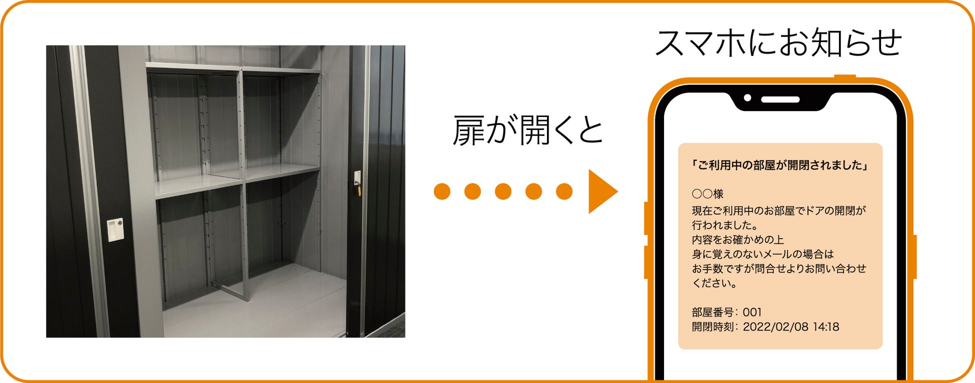 会員様に安心してご利用いただけるよう、ご契約いただいたトランクルームの扉の開閉があった際はスマホにてお知らせいたします。