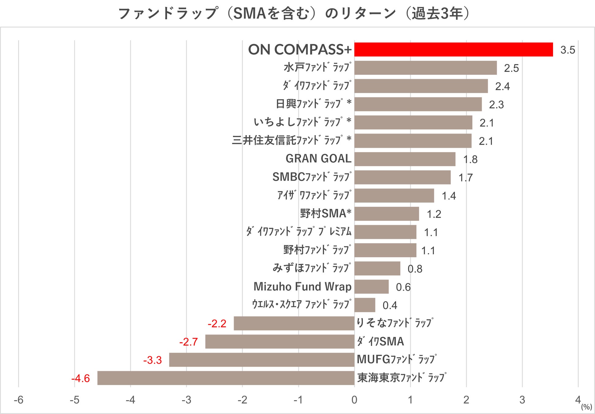 *日興ファンドラップ(エドモンド・ロスチャイルド)、いちよしファンドラップ ドリーム・コレクション、三井住友信託ファンドラップ (SMA)、野村SMA (エグゼクティブ・ラップ)