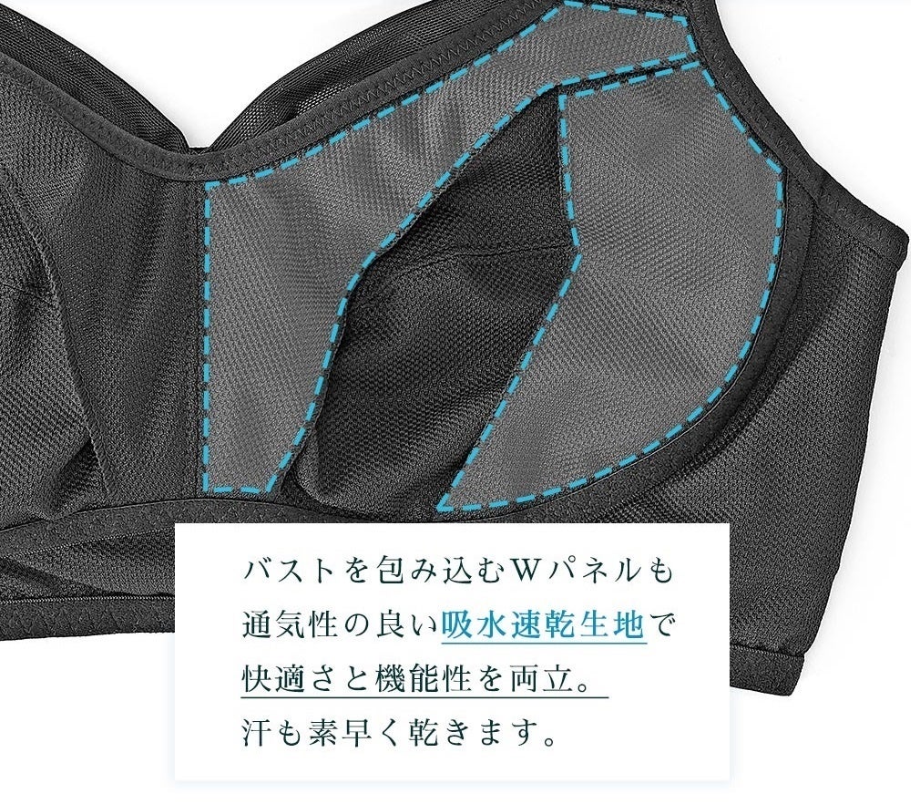 カップ裏に汗や水分を吸水して素早く乾かし、蒸れを軽減してくれる吸水速乾の生地を使用。バックベルトには伸縮性のある薄手のパワーネット生地を使用し、着用感にもこだわりました。