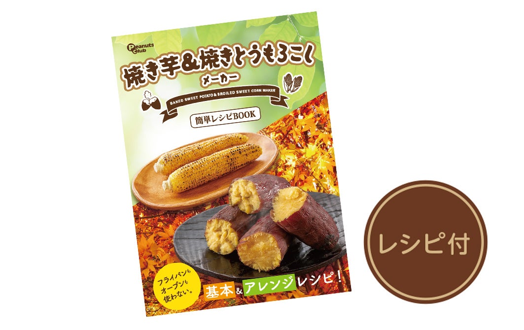 ホクホク焼き芋、こんがり焼きとうもろこしのほか、やみつきジャーマンポテトの作り方を収録した簡単レシピブックつき。