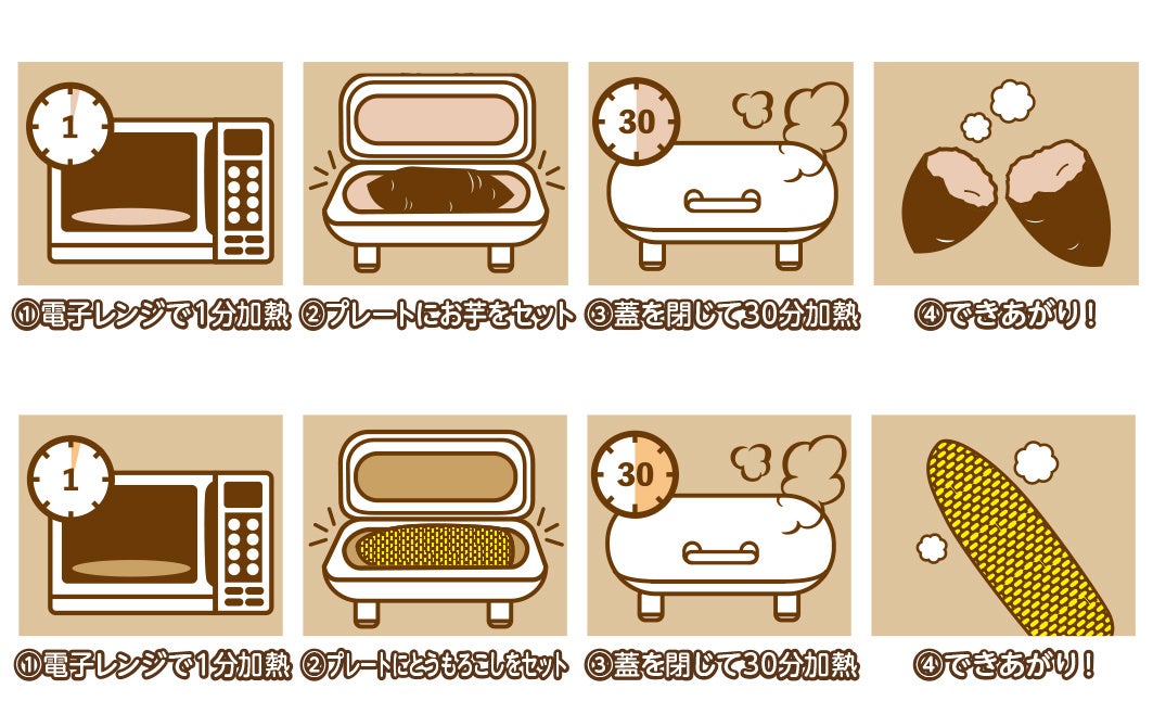 本製品は、簡単な手順で、香ばしい焼き目のついた本格的な焼き芋や焼きとうもろこしを作ることができる調理家電です。