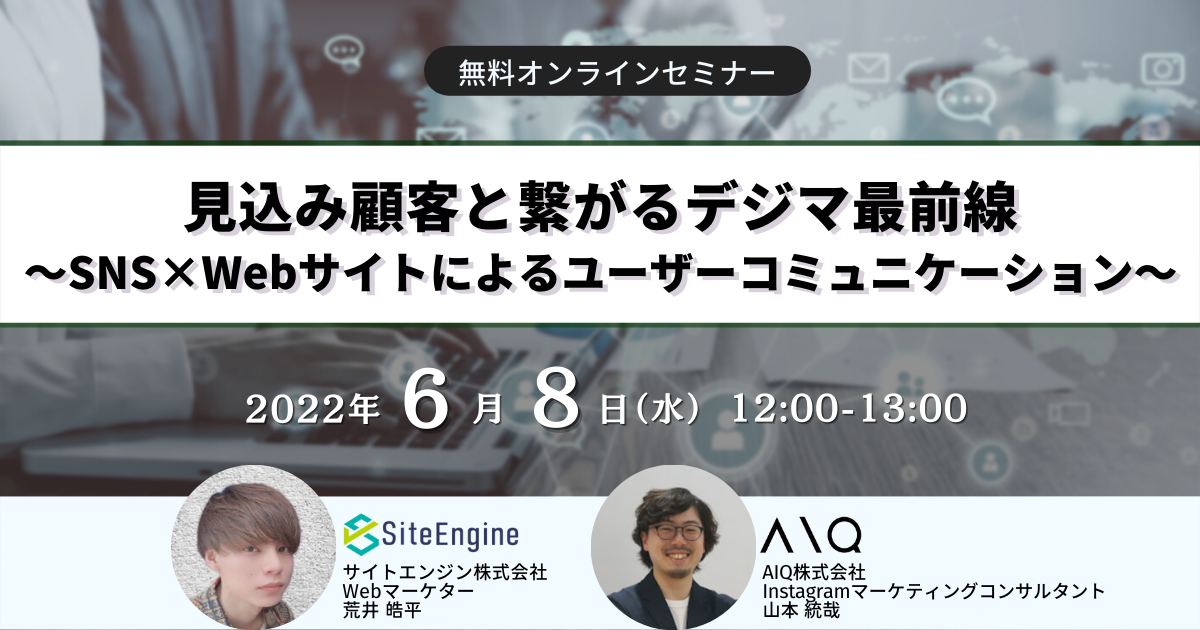 「改善のタネを広める」を経営理念としてWebマーケティング支援サービスを提供するサイトエンジン株式会社(本社:東京都世田谷区 代表取締役:毛塚智彦)は、2022年6月8 日(水曜)12:00~13:00に、AIQ株式会社(本社:東京都新宿区 代表取締役:高松睦)との” 見込み顧客と繋がるデジマ最前線〜SNS×Webサイトによるユーザーコミュニケーション〜” を開催します。