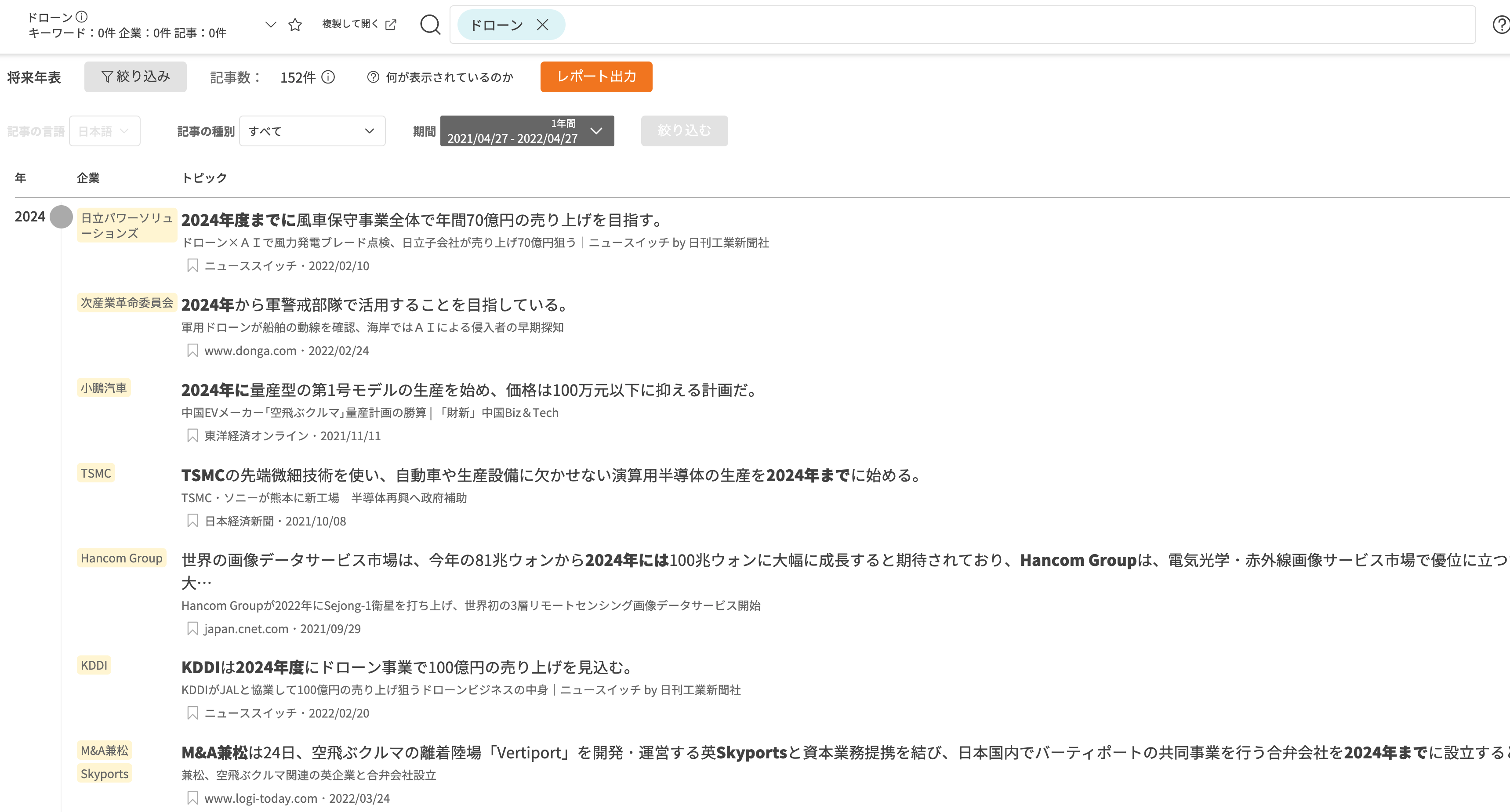 ストックマーク株式会社(以下、「当社」)は最先端の自然言語処理技術を活用した市場分析サービス『Astrategy』において、キーワードを入力するだけで、WEB上のオープンデータから関連する企業の将来活動を一瞬で把握できる「将来年表」の提供を開始しました。本機能により、新規事業開発や製品開発における市場分析を効率化し、バックキャスティングによる企画立案を容易にすることで、企業様の事業創造活動を支援いたします。