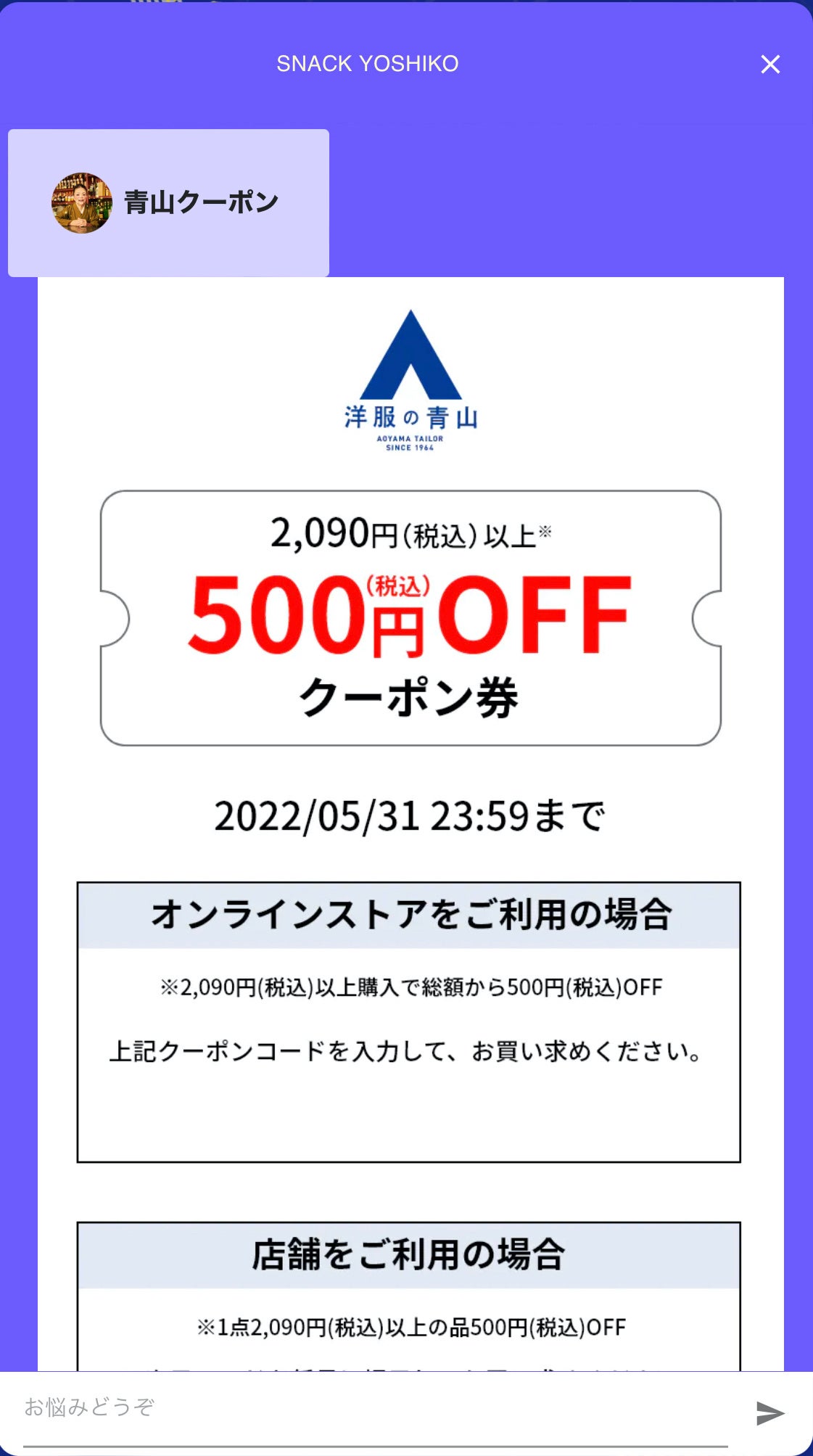 特定ワードや商品の購入意向がある相談には、よしこママから「洋服の青山」の店舗や公式オンラインストアで使用できるクーポン券が提供される機能を実装しました。