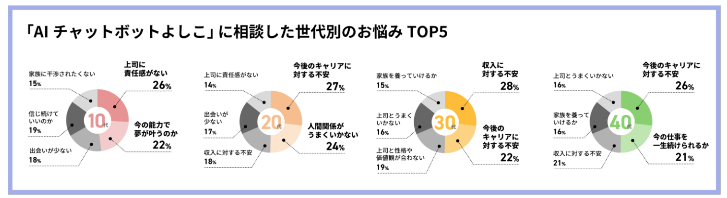 これまでよしこママに寄せられた11万件以上の悩みを世代別に分類したところ、10~30 代では「出会いが少ない」「人間関係がうまくいか ない」「孤独を感じる」などコロナ禍ならではのコミュニケーション不足の悩みがランクインしていました。また、全世代を通して「今後のキャリアに対する不安」や「収入に対する不安」が上位に入り、働く 上での漠然とした不安を抱えていることもわかりました。