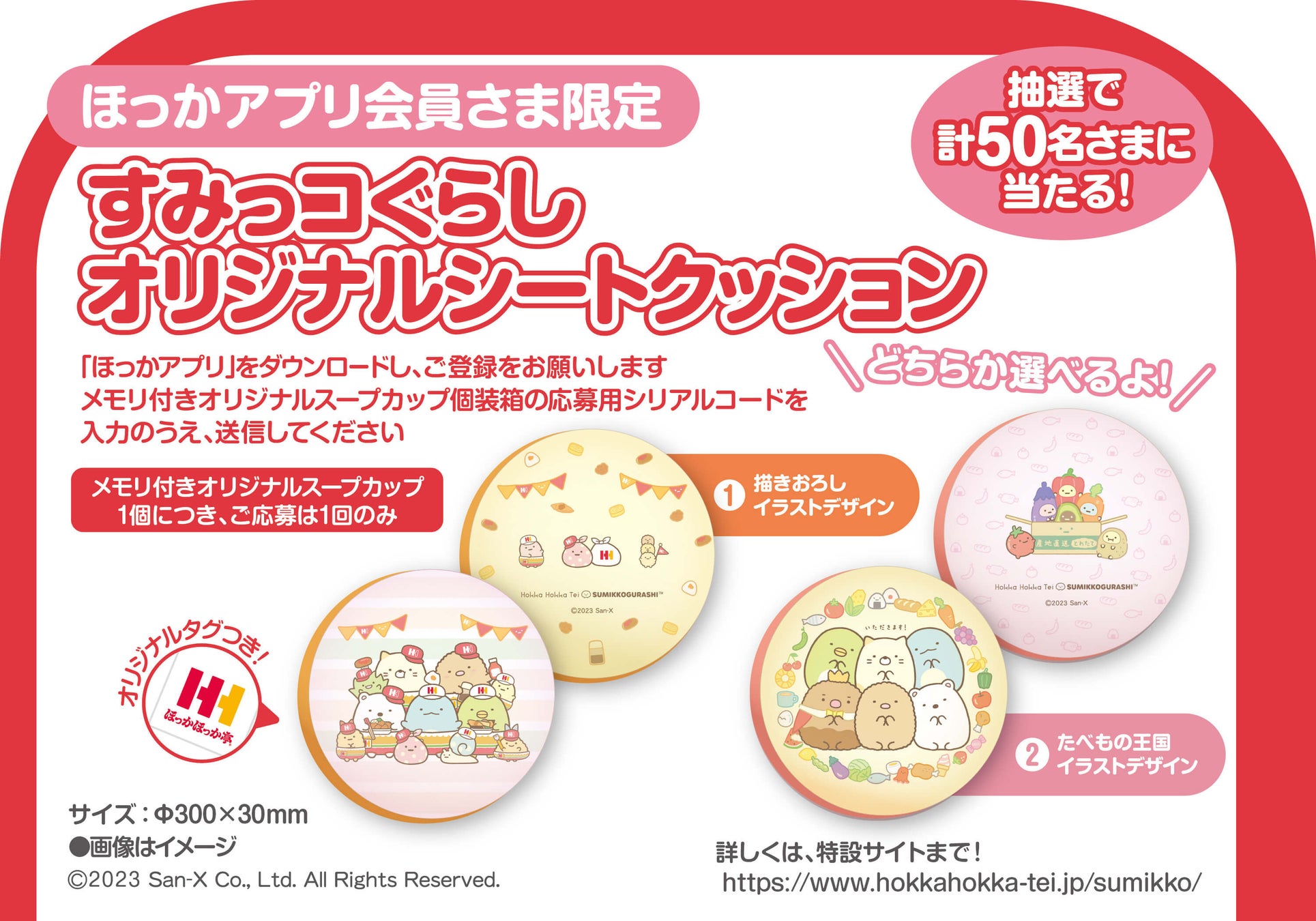 更に、恒例のほっかほっか亭公式アプリ「ほっかアプリ会員さま限定企画」を実施致します。メモリ付きオリジナルスープカップの個装箱の裏側に貼付されている応募シリアルコードを、ほっかアプリの特設ページに入力のうえご応募ください。抽選で計50名さまに、「すみっコぐらしオリジナルシートクッション」をプレゼント。どしどしご応募ください。