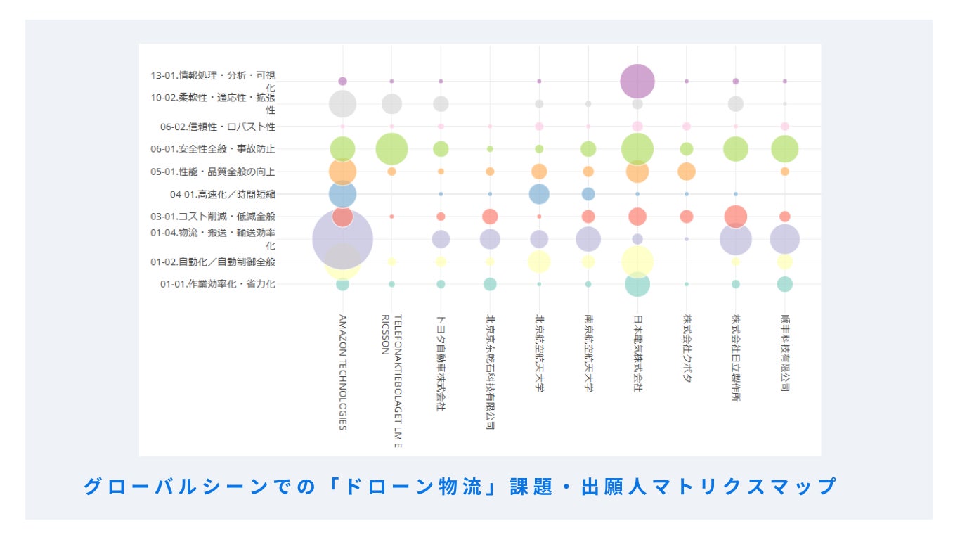 海外特許に付与された日本語の分類ラベル(用途・課題ラベル)を使用して、グローバルで横断した用途・課題マッピングが可能になります。