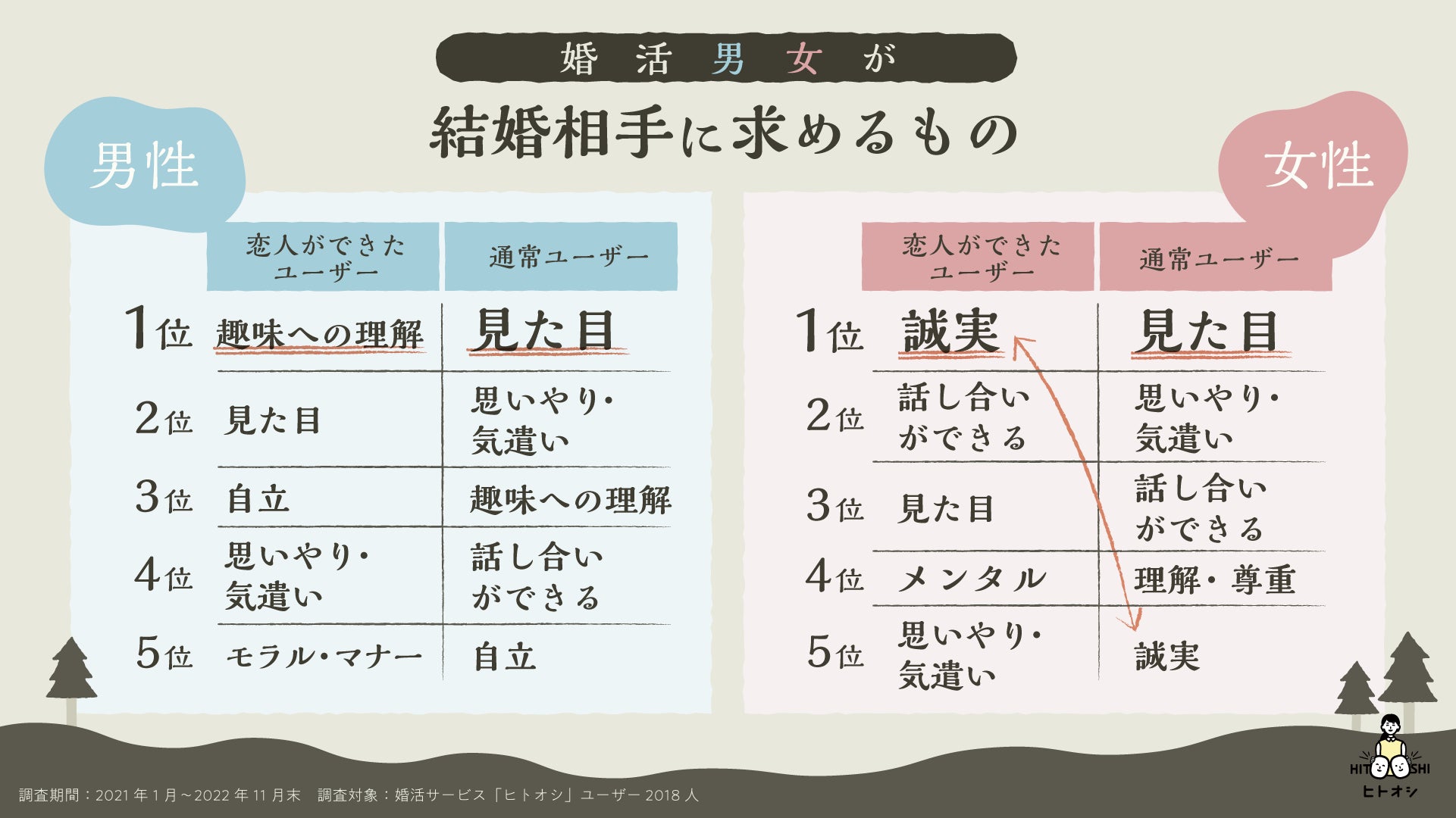 男女ともに通常ユーザーの1位が「見た目」を重視している一方で、恋人ができたユーザーの「結婚相手に求めるもの」は、男性1位が「趣味への理解」、女性1位が「誠実」と見た目よりも内面や価値観が「結婚相手に求めるもの」の1位であることがわかりました。