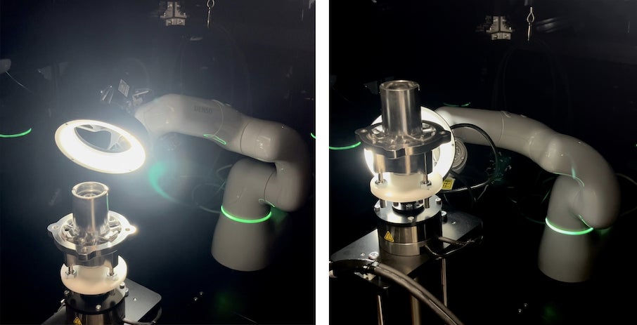 (左)ロボットアームと連動してLED照明が点滅し、ワーク表面の不具合を検出します。