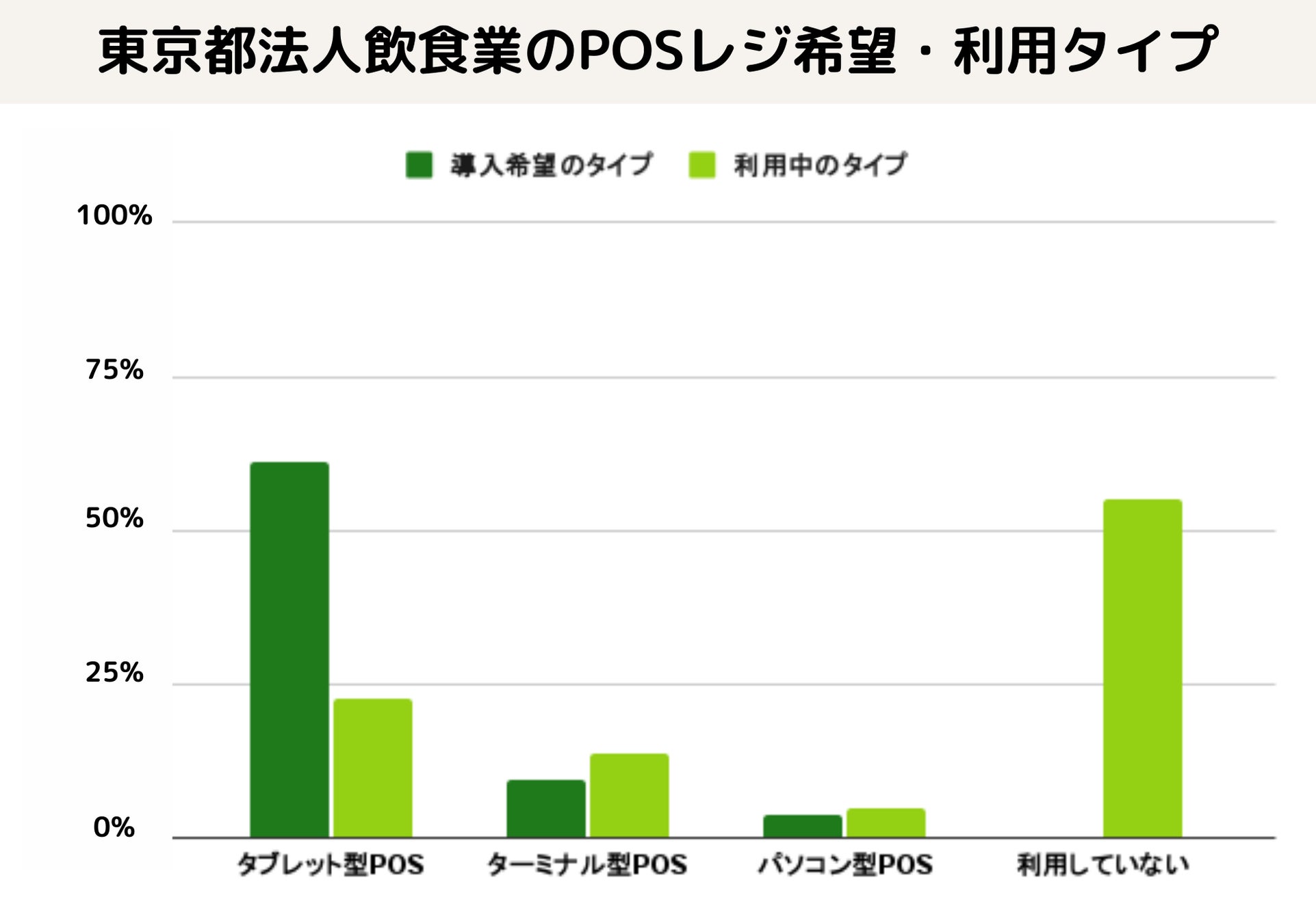 現利用機種を見ると、東京都の法人のターミナル型利用率は13%、タブレット型は22%。これに対して、導入希望機種はターミナル型9%、タブレット型61%と、タブレット型への移行意欲が見られます。