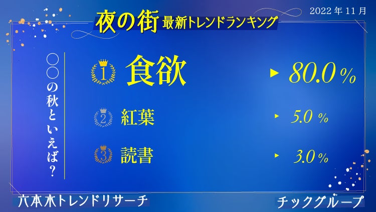 秋といえば?というテーマでトレンド調査した今回。六本木は圧倒的に「食欲」という声が多く、興味関心は食欲に偏っている様子。流行っている食べ物は「さつまいもスイーツ」(17.0%)と「カヌレ」(16.0%)が六本木では現在流行中の様子。さらに連れて行ってほしいお店として、六本木にお店を構える「ウルフギャング・ステーキハウス」(17.0%)が挙げられました。2位「NOBU TOKYO」(12.0%)も六本木からほど近い虎ノ門にあるレストラン、3位に関してはSNSで話題の「牛宮城」(11.0%)がランクインしています。