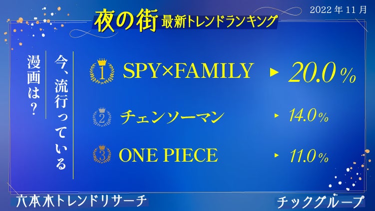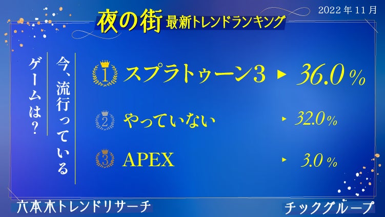 さらに食以外の項目についても調査しました。漫画ジャンルでは8月調査した際、身近で流行っているものランキングにも登場した「アーニャ」の登場する「SPY×FAMILY」が1位。2位に「チェンソーマン」(14.0%)がランクイン。全世代共通の「ONE PIECE」(11.0%)は3位という結果に。ゲームに関しては「やっていない」(32.0%)という結果と拮抗して「スプラトゥーン3」(36.0%)が堂々の1位。3位に「APEX」(3.0%)がランクイン。