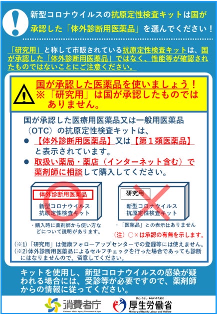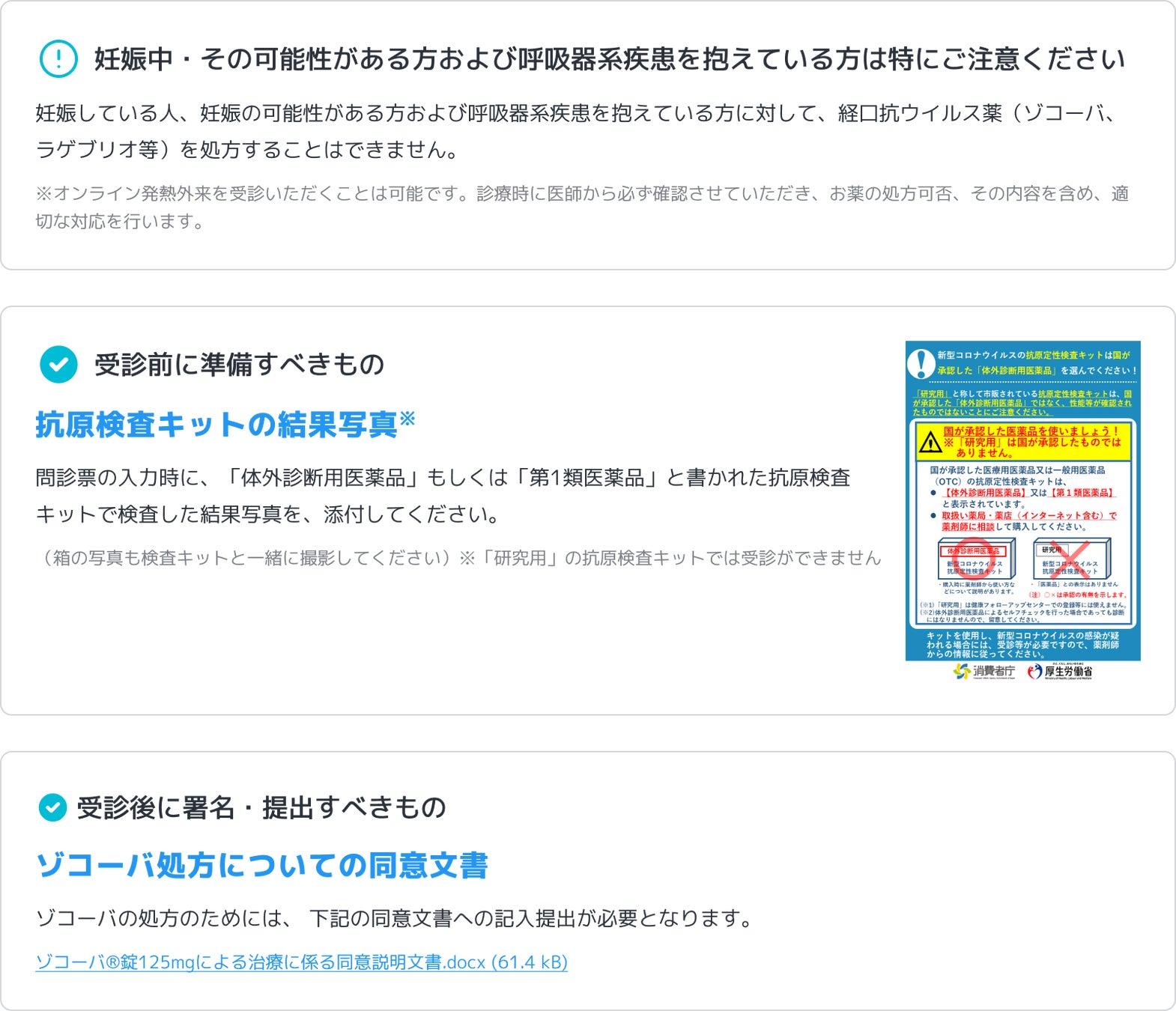 オンライン発熱・コロナ外来での経口抗ウイルス薬(ゾコーバ、ラゲブリオ等)の処方に当たっては、医師の診察前に「体外診断用医薬品」もしくは「第1類医薬品」と書かれた抗原検査キットで検査した結果の写真を、問診票の入力時に送っていただきます。