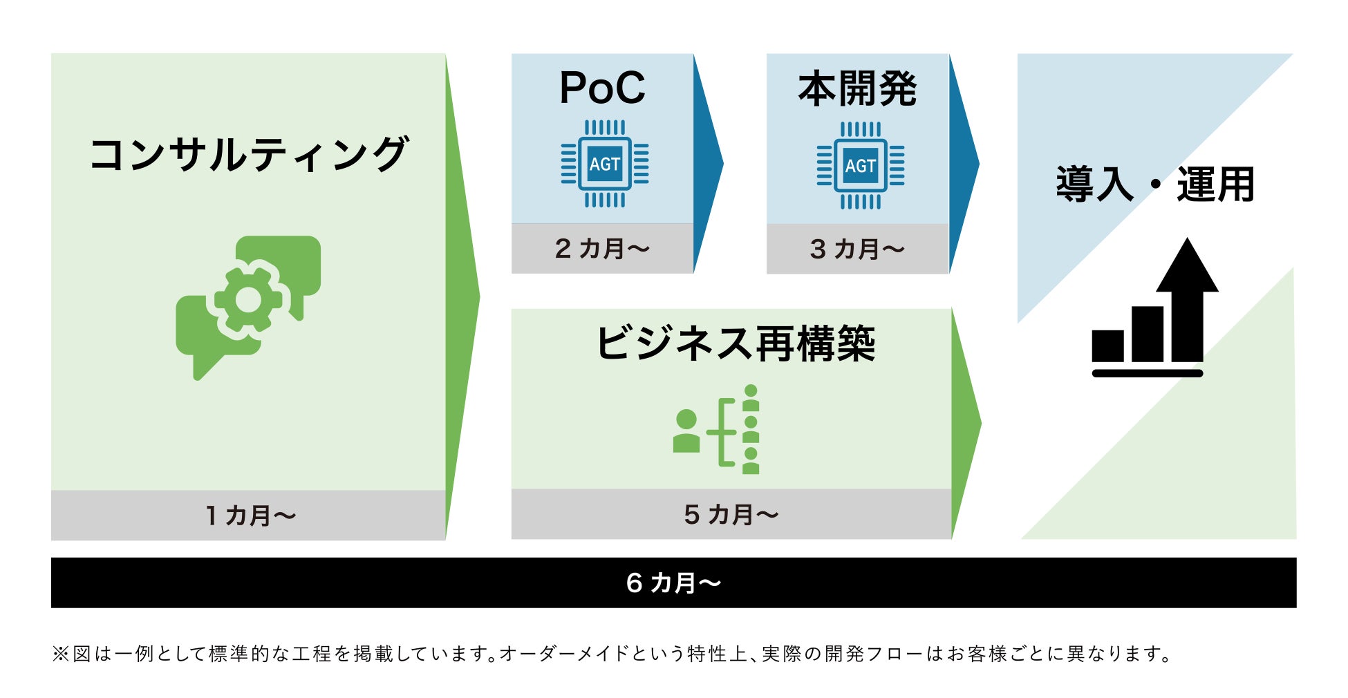 より高度なAIエージェントの活用にあたっては、単に導入するのみでは失敗するケースが少なくなく、AIエージェントが機能しやすい形に業務プロセスや企業体制などビジネス側を再構築することが必要です。本ソリューションの提供にあたっては、開発のみに留まることなく、バリューアップ型AIによる企業変革に向けたこれまでの当社支援実績をベースに、ビジネス再構築にも伴走し、企画・開発・導入・運用までワンストップでサポートいたします。