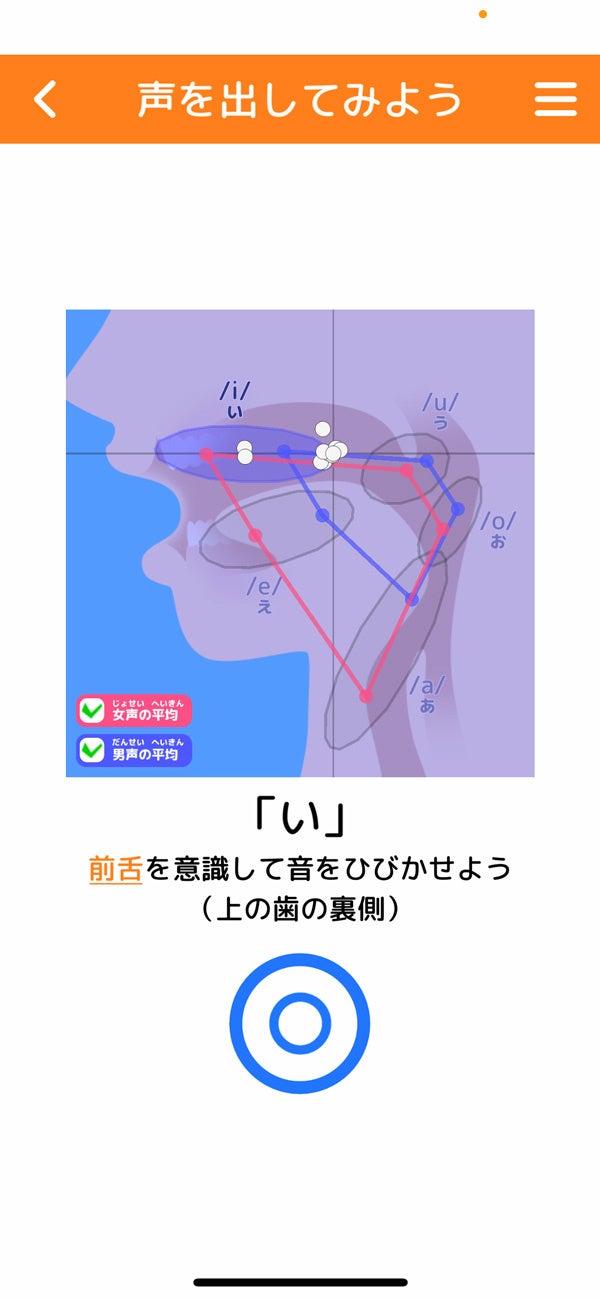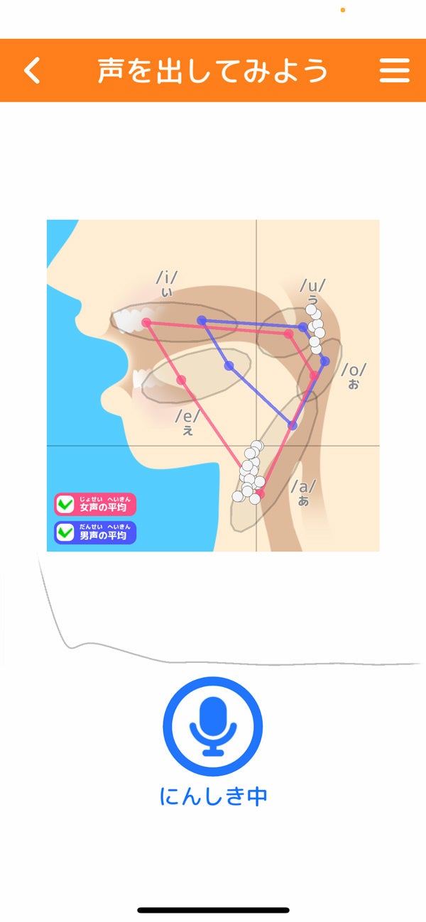 母音の判定を期待通り行えるかどうか、本来出したい母音の音に声を近づけていくためのトレーニングが一人でもできるアプリです。アプリをインストールした端末のマイクから入力された声を分析し、母音を判定します。入力された声が、日本語「あ」~「お」のどの母音に近い音かをリアルタイムで判定。バイブレーションとアプリ画面にて結果を表示します。