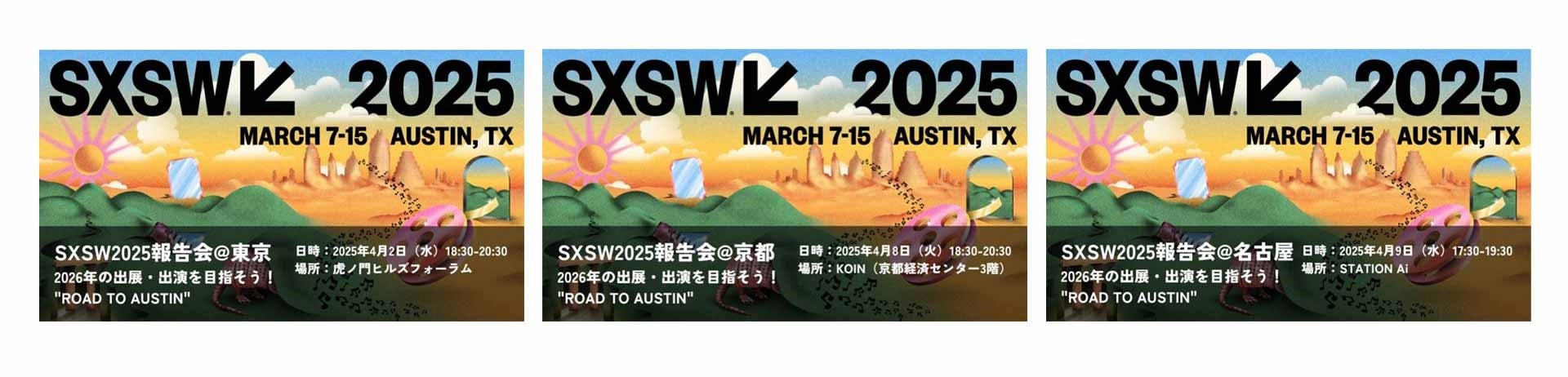 SXSW Japan Officeでは、4月に公式報告会を東京・京都・名古屋で開催します。SXSW2025の出展者や視察者はもちろんのこと、SXSWへの参加にご興味のある方はどなたでもご参加できます。詳細は各イベントページよりご確認ください。