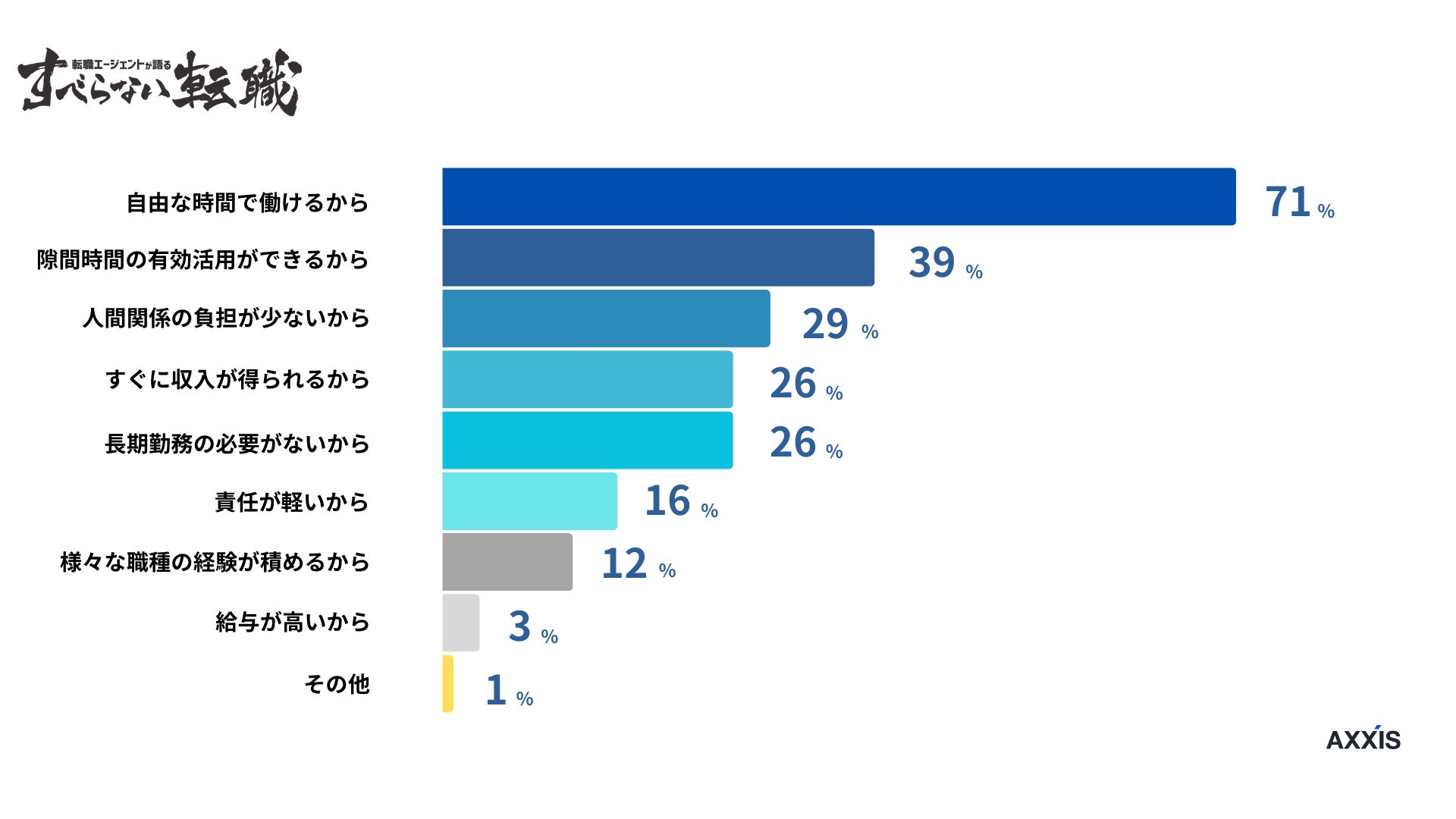 次に、長期アルバイトではなくスポットワークを選ぶ理由としては、「自由な時間で働けるから」と回答した人が71%と最も多く、次いで39%の人が「隙間時間の有効活用ができるから」と回答、29%の人が「人間関係の負担が少ないから」と回答しました。このことから、柔軟な働き方や隙間時間の活用がスポットワーク選択の主な理由であることが伺えます。