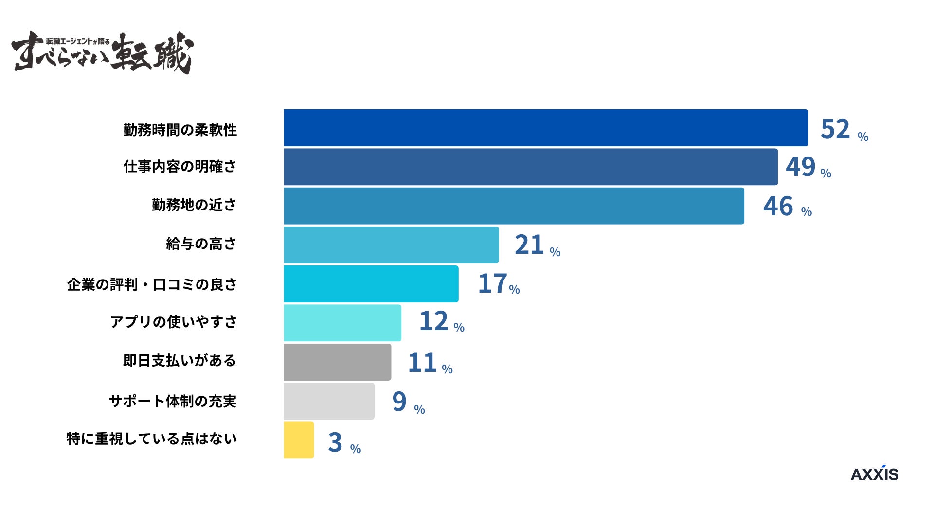 そして、スポットワークを選ぶ際に重視する点としては、52%の人が「勤務時間の柔軟性」と回答しました。次いで49%の人が「仕事内容の明確さ」、46%の人が「勤務地の近さ」と回答しました。これにより、多くの人が仕事内容や勤務地の条件に加え、柔軟な勤務時間を重視していることが示されています。