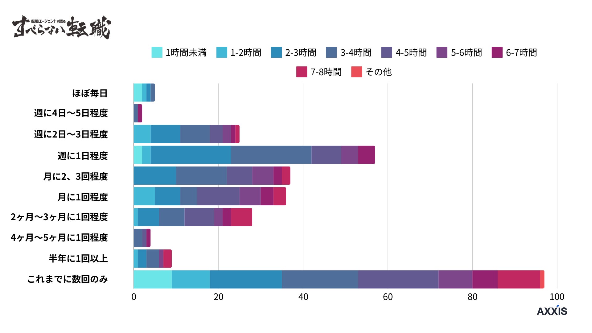 まず、スポットワークの利用頻度では、「週に1日程度」や「月に2、3回程度」といった定期的な利用が多いことが分かります。また、利用時間は「1〜3時間」と短時間での利用が一般的で、長時間にわたる利用は少数派である傾向が見られます。これらのことから、多くの人が定期的かつ短時間でスポットワークを取り入れていることがうかがえます。