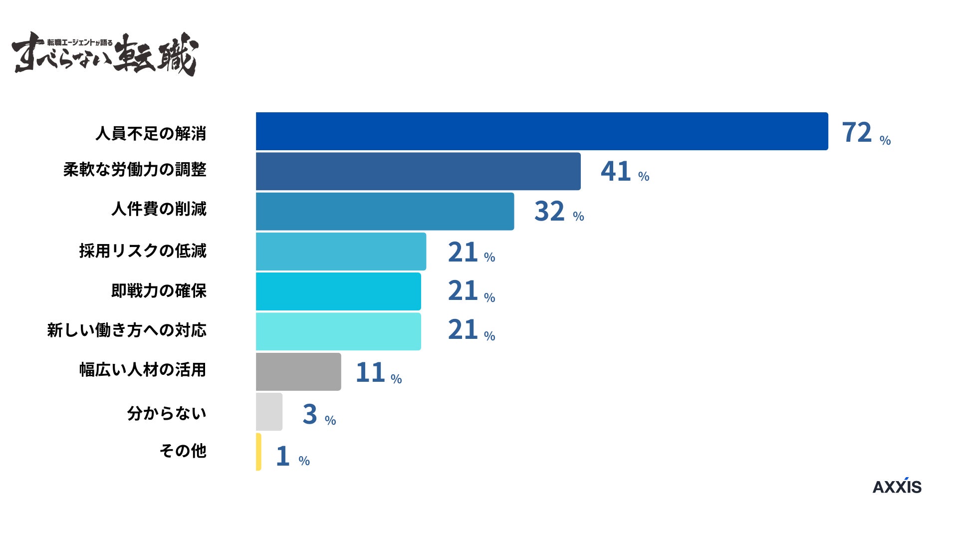 最後に、企業側がスポットワークを取り入れるメリットとしては、「人員不足の解消」が最も多く挙げられ、次いで「柔軟な労働力の調整」、「人件費の削減」などが挙げられています。スポットワークは、人員を効率的に補完し、採用リスクを低減するなど、企業にとっても柔軟かつ経済的な人材活用手段であることがわかります。
