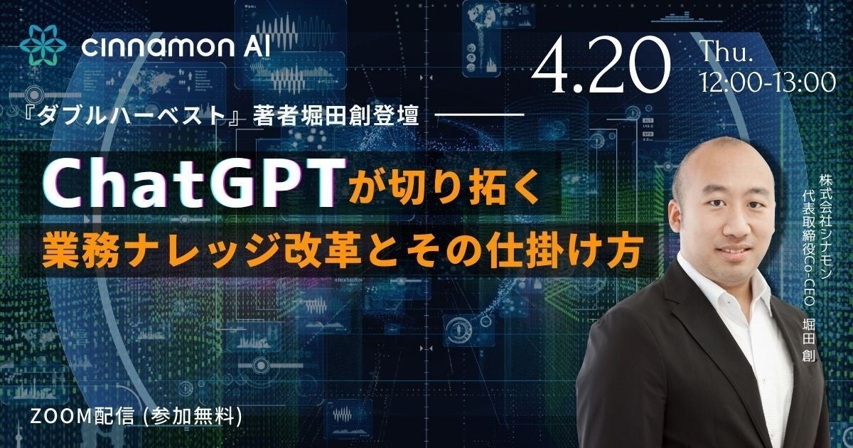 シナモンAI、ChatGPT 無料ウェビナー第二弾『ChatGPTが切り拓く 業務ナレッジ改革とその仕掛け方』4月20日(木)12:00-13:00開催