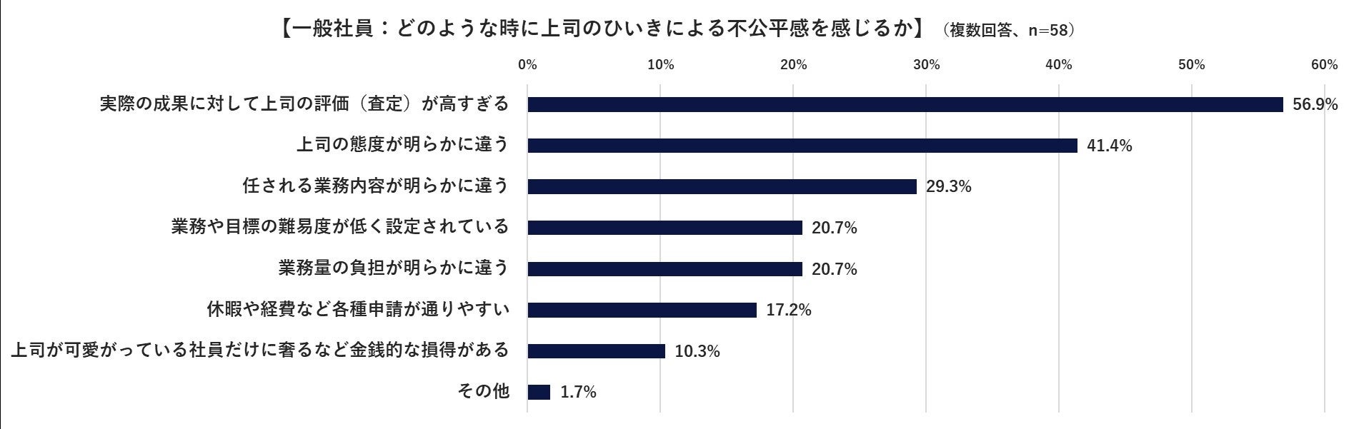 Q5. あなたはチームメンバーに対する上司のひいきで不公平を感じたことがありますか。(単数回答、n=150 ※一般社員)また、どのような時に上司のひいきで不公平を感じますか。(複数回答、n=58 ※一般社員)