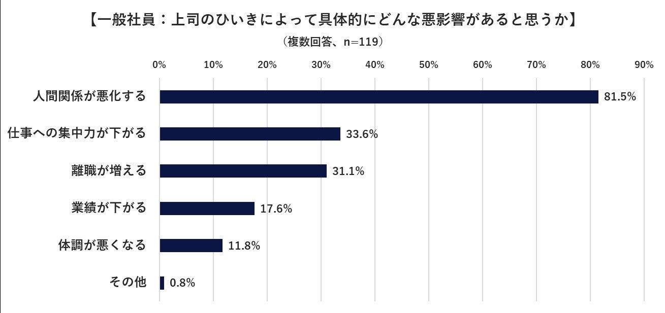 上司のひいきによって組織に悪影響を及ぼすと思うかお聞きしたところ、「そう思う」35.3%、「ややそう思う」44.0%をあわせると約8割の方が悪影響を及ぼすと回答しました。また、「悪影響を及ぼすと思う」と回答した方へひいきによってどんな悪影響があると思うか聞いたところ、「人間関係が悪化する」が81.5%、「仕事への集中力が下がる」が33.6%、「離職が増える」が31.1%でした。上司が特定の部下や後輩を特に可愛がるなど、ひいきをすることで、職場の人間関係の悪化を招き、部下の業務にも悪影響を与え、チームのマネジメントがしにくくなることが懸念されます。