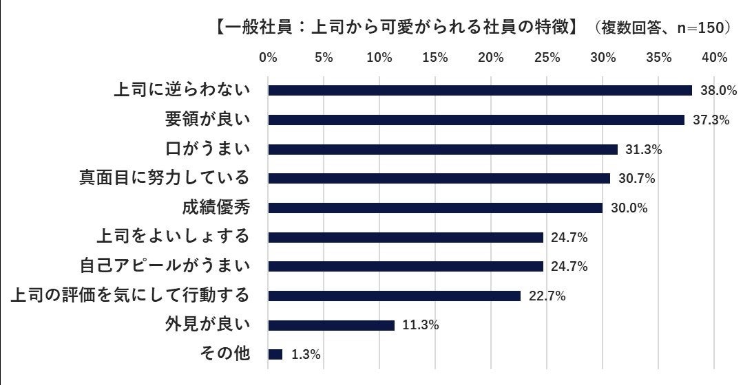 Q4. あなたが所属するチームで上司から特に可愛がられていると思うメンバーはいますか。(単数回答、n=150 ※一般社員)また、上司から可愛がられる社員の特徴は何だと思いますか。(複数回答、n=150 ※一般社員)