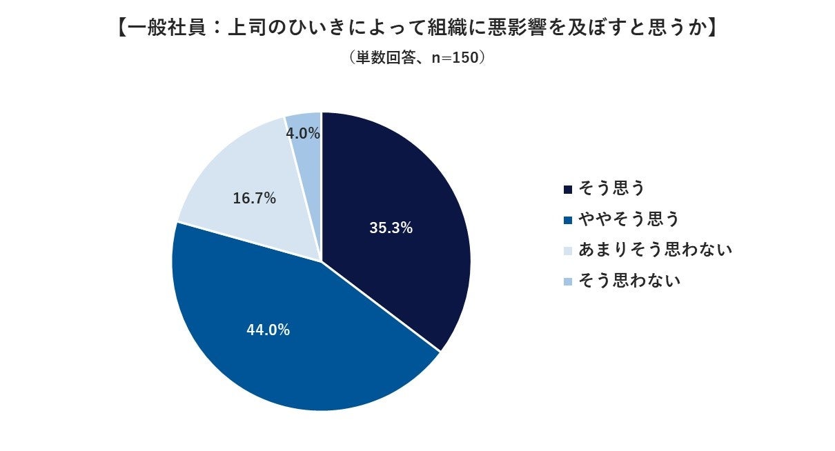 その結果、上司のひいきによって不公平を感じたことがある部下が約4割いること、不公平を感じる場面として「実際の成果に対して上司の評価(査定)が高すぎる」と半数の方が感じていることがわかりました。また、部下の約8割が上司のひいきが「組織に悪影響を及ぼす」と回答し、上司がチーム内で特定の人物を可愛がるなど、個人的な感情を含んで部下と接することにより、組織マネジメントに悪影響が出る恐れが明らかになりました。