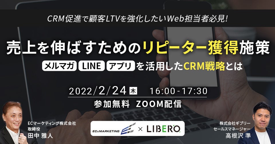 そこで、本セミナーではECサイトを中心に売上アップのサポート実績のあるECマーケティングとギブリーの2社が、CRM活用に課題を感じられているWeb担当者様向けに、売上を伸ばすためのリピーター獲得戦略について解説するセミナーを開催します。