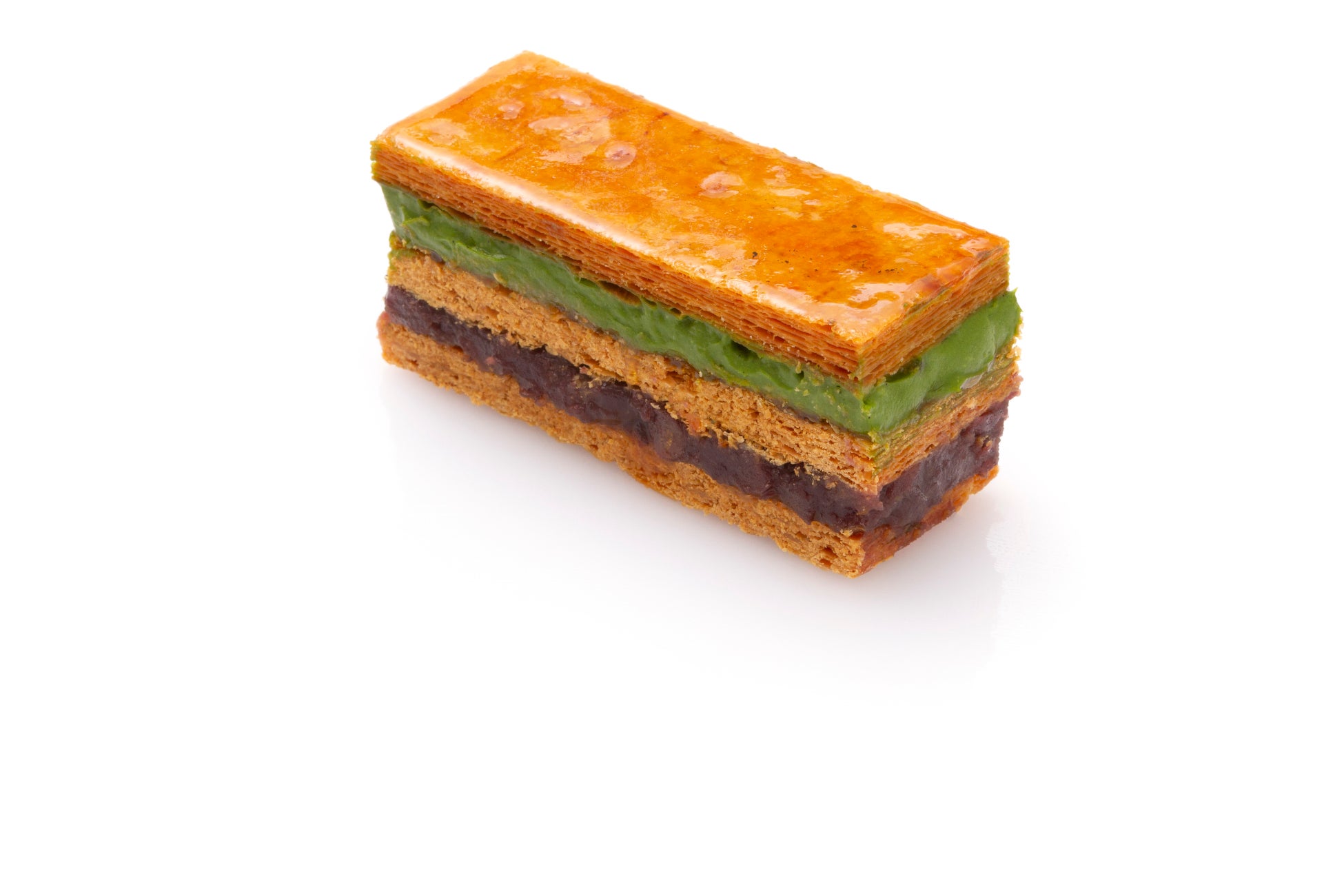 長年自身のお菓子に取り入れたいと思い続けていた“丹波の大納言小豆”を使った渾身のミルフィーユ。フランス古典菓子を大胆にアレンジしつつもフランス菓子としての軸はぶれないのは、フランス菓子に精通し和素材を熟知しているアオキだからこそ成せる技。エシレバター×大納言小豆×宇治の抹茶がもたらす味わいのコントラストに驚きと感動が味わえる逸品です。