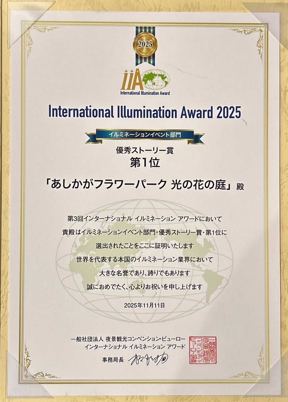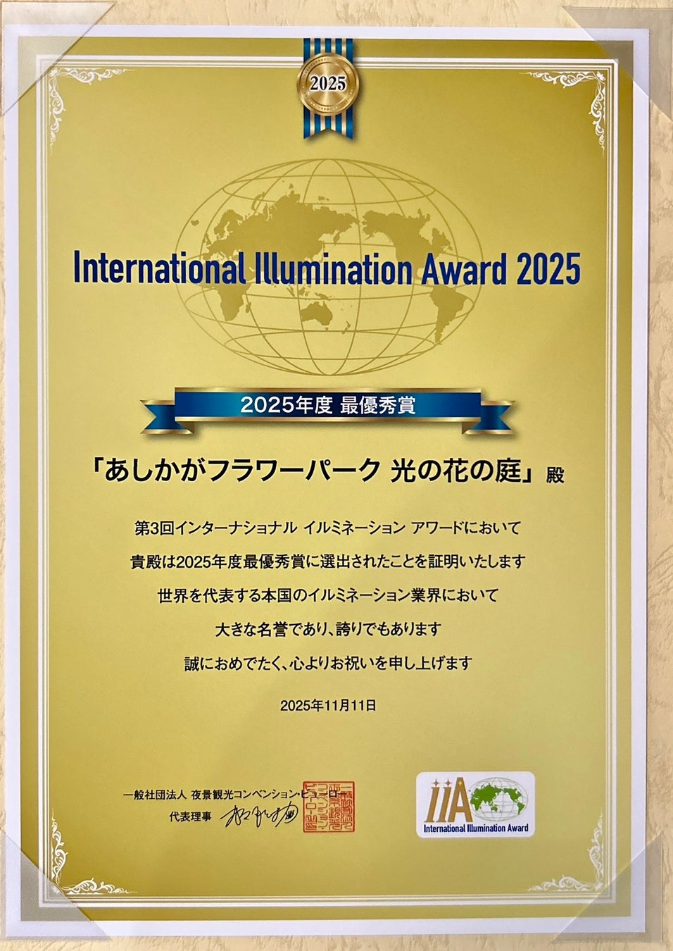 (株)足利フラワーリゾート(本社 栃木県足利市田中町906-13 代表 早川公一郎)が運営を行う、あしかがフラワーパークのイルミネーション『光の花の庭』が、 (一社)夜景観光コンベンション・ビューロー(代表理事:丸々もとお)が主催、ぴあ株式会社が共催する『第3回 International Illumination Award』(通称:IIA)において年間を通して最も優れた施設に与えられる「最優秀賞」を受賞し、日本一の称号を獲得いたしました。
