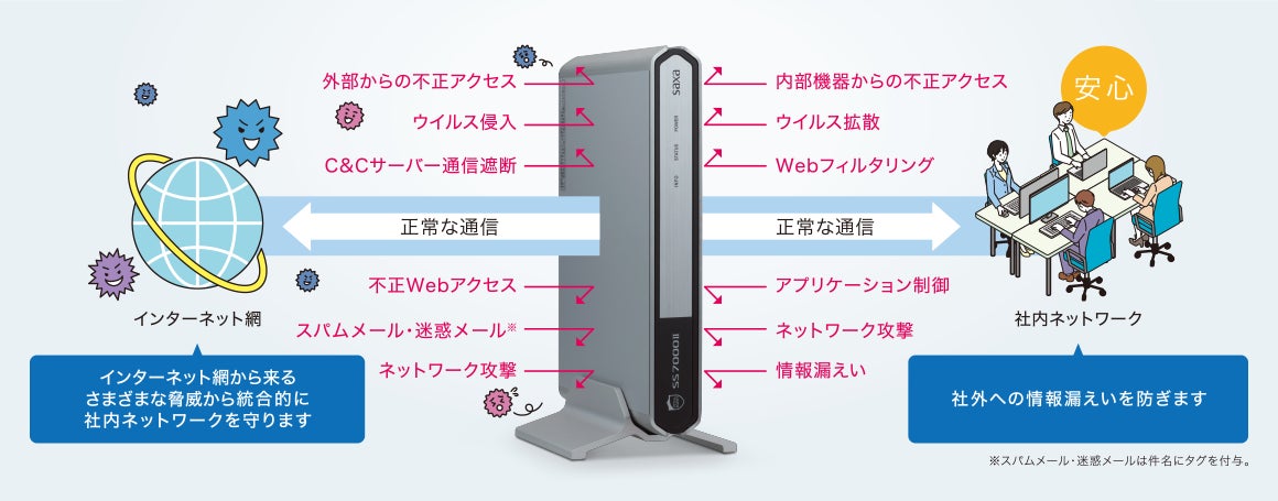 サクサのUTMは、多彩なセキュリティ機能を搭載した総合的なネットワークセキュリティシステムで、脅威管理の一元化を実現させます。Webフィルタリング機能をはじめ、アンチウイルス機能や迷惑メールブロック機能、侵入検知/防止機能など、インターネットに関連するあらゆる脅威を一括で対策することができます。