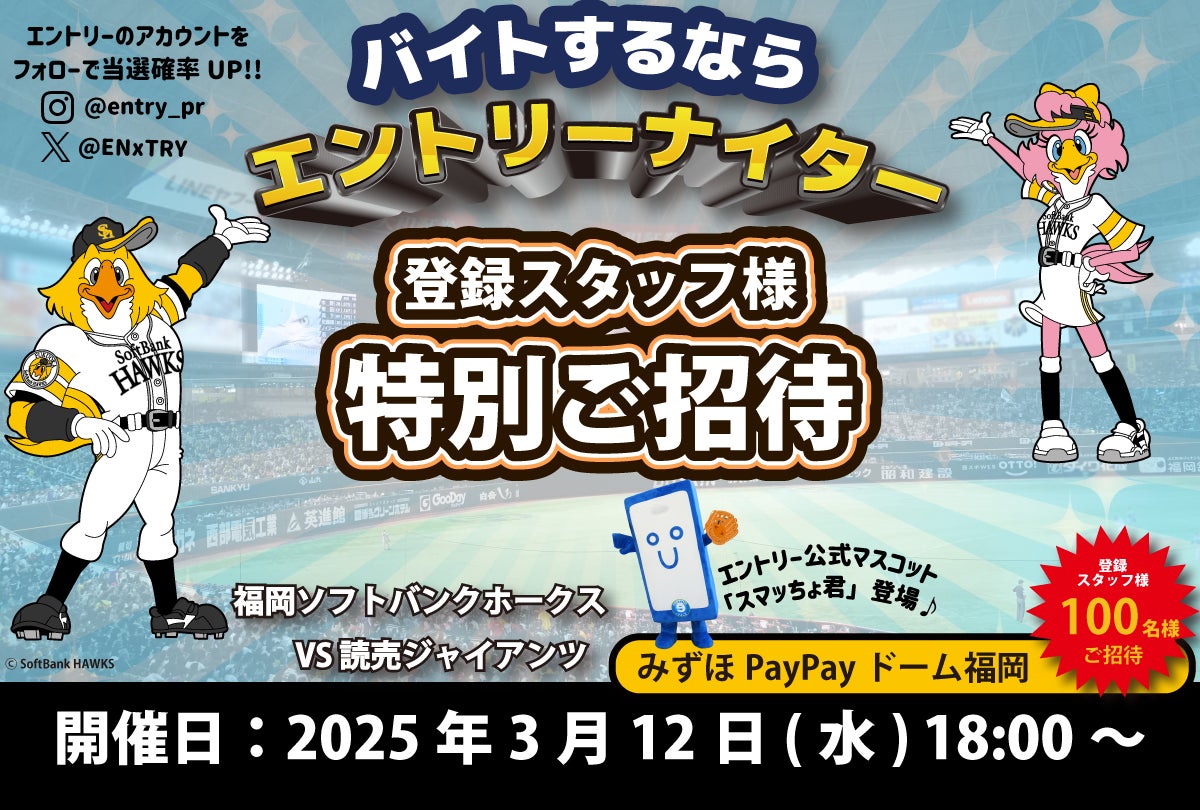 “人と仕事の縁むすびに挑戦し続ける”を企業理念に、主にお仕事紹介サイト「スマジョブ」やお仕事マッチングサービス「シェアジョブ」を運営する株式会社エントリー(本社:東京都新宿区、代表取締役:寺本潤、以下エントリー)は、2025年3月12日(水)にみずほPayPayドーム福岡で開催される福岡ソフトバンクホークスvs読売ジャイアンツオープン戦に冠協賛いたします。