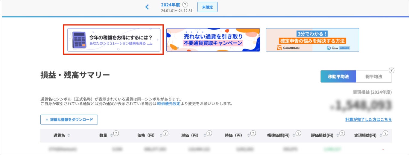 含み損(未決済の損失)を抱えている通貨を売却し、利益を適切に抑えるためのシミュレーションを行う機能です。「Gtax(個人版)」内で損益計算を完了後、「今年の税額をお得にするには?」のバナーをクリックいただくと、「どの通貨を・どの数量で・どの程度の単価で」売却すると利益を抑えることが可能か、ご提案内容を表示します。