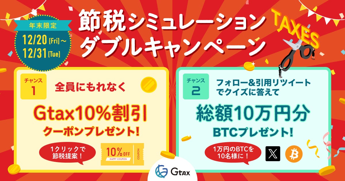 Gtax節税シミュレーションWキャンペーン|今だけ10%OFF&BTC総額10万円分が当たる!:https://crypto-city.net/media/simulation-campaign-2024