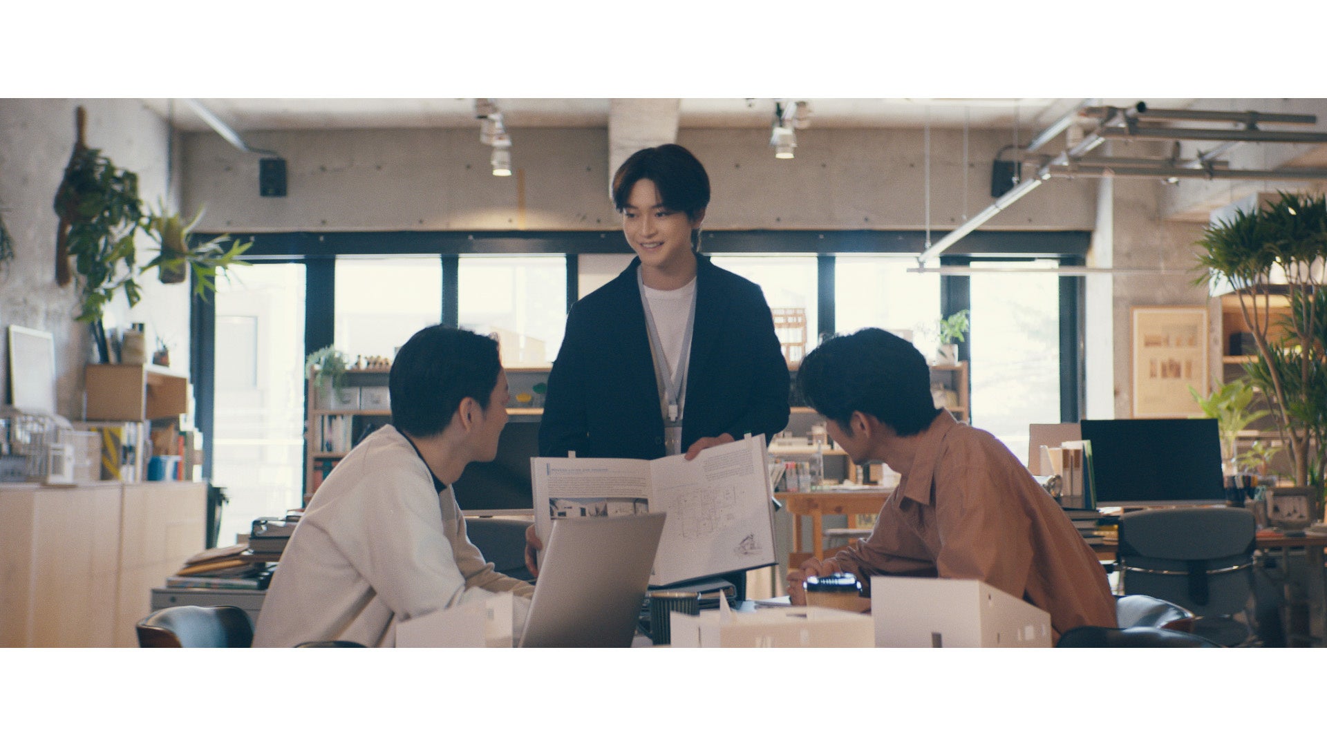 これまでは大学のキャンパスや体育館など学生の日常を切り取ったCMでしたが、今回はインターン先の建築事務所が舞台。普段と違った雰囲気の中で、本エピソードのテーマである「成長」を伝えられるよう、高橋さんが監督と意見を出し合う姿が印象的でした。ぜひメイキングもご覧ください。