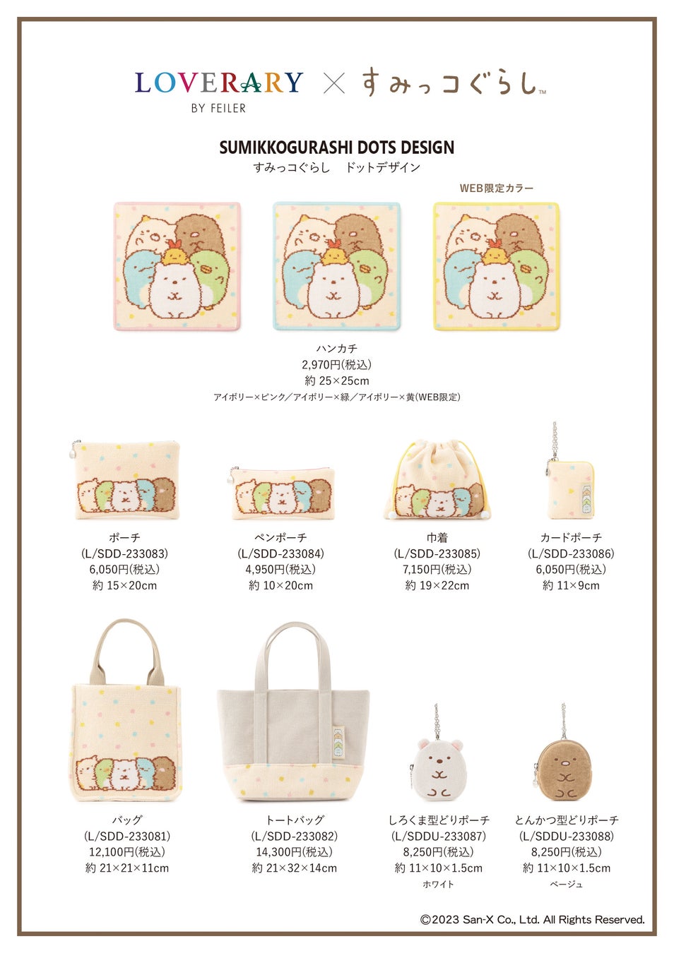 販売するアイテムは、ハンカチ3種類(縁どりのカラー違い) 各¥2,970(25×25cm)、ポーチ¥6,050(15×20cm)、ペンポーチ¥4,950(10×20cm)、カードポーチ¥6,050(11×9cm)、巾着¥7,150(19×22cm)、バッグ¥12,100(21×21×11cm)、トートバッグ¥14,300(21×32×14cm)、しろくま型どりポーチ¥8,250(11×10×1.5cm)、とんかつ型どりポーチ¥8,250(11×10×1.5cm)の全11種類です。