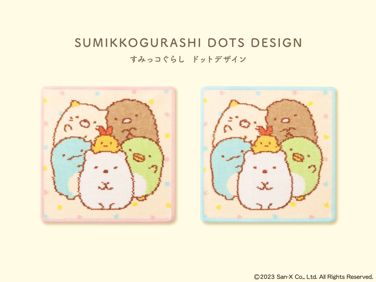 すみっコぐらしの人気キャラクターしろくま、ぺんぎん?、とんかつ、ねこ、とかげ、えびふらいのしっぽと、パステルカラーのドットを組み合わせました。フェイラーのシュニール織の柔らかな質感とすみっコぐらしのかわいいデザインに癒されます。