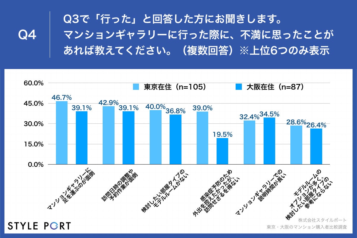 ・マンションギャラリーに足を運ぶのが面倒:46.7%・訪問日時の調整や予約作業が面倒:42.9%