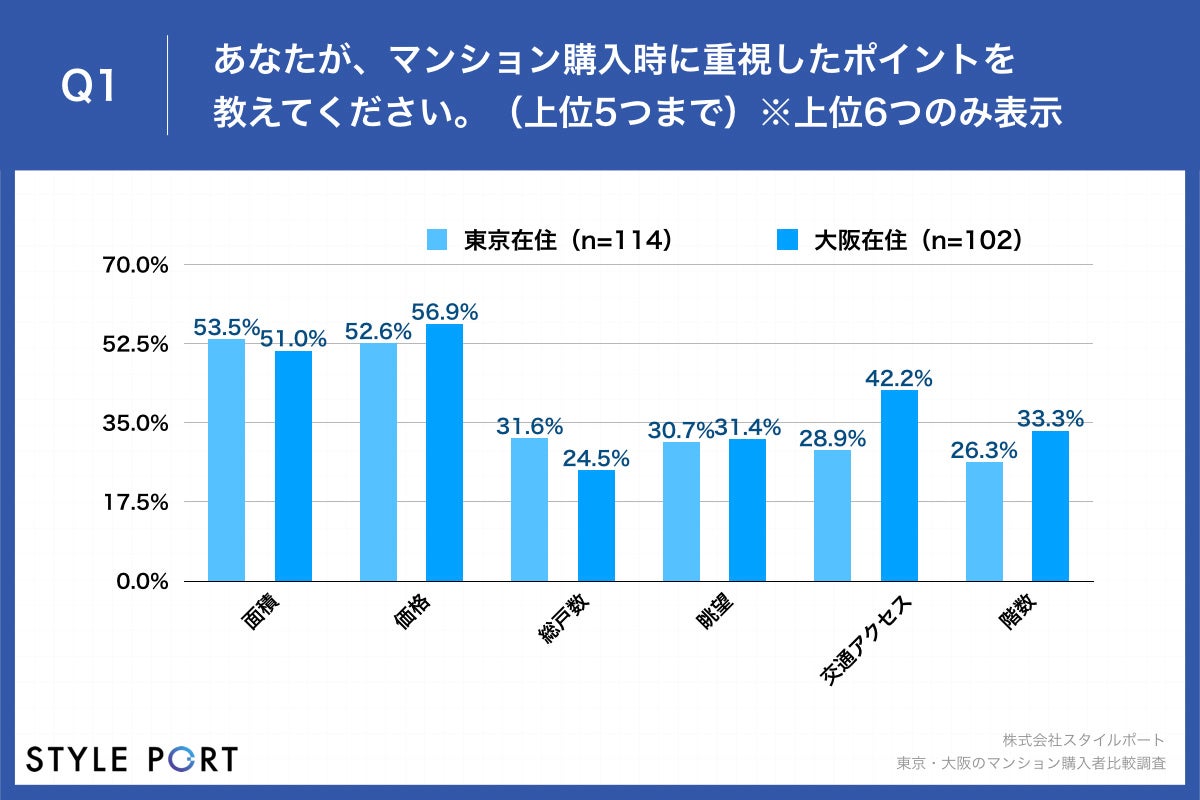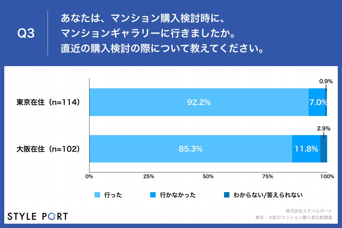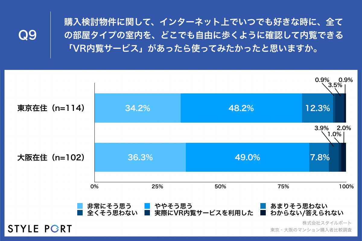 住宅の3Dコミュニケーションプラットフォーム『ROOV(https://roov.jp/)』(※)を開発・提供する株式会社スタイルポート(本社:東京都渋谷区、代表:間所 暁彦、以下スタイルポート)は、コロナ禍で居住用の新築マンションを購入した東京都住在の男女114名、大阪府住在の男女102名に対し、東京・大阪のマンション購入者比較調査を実施しました。