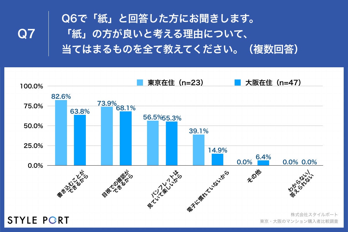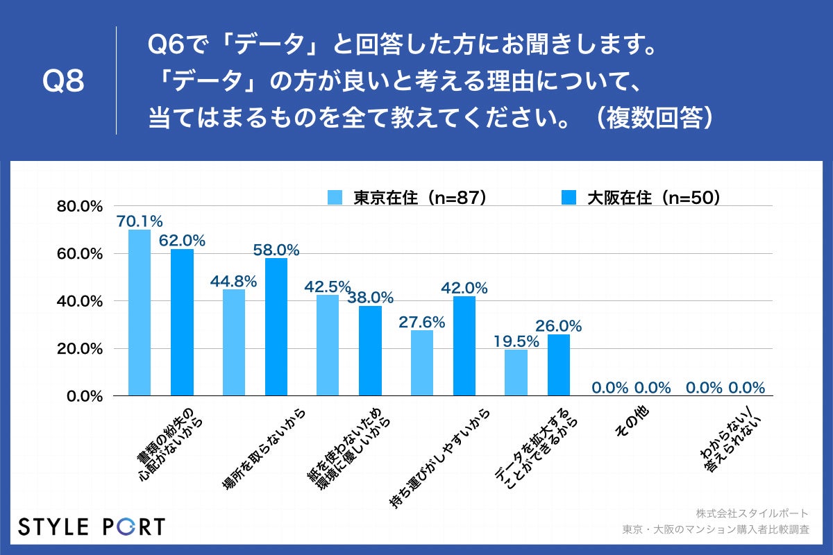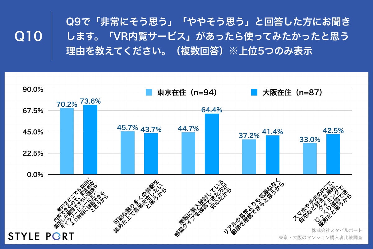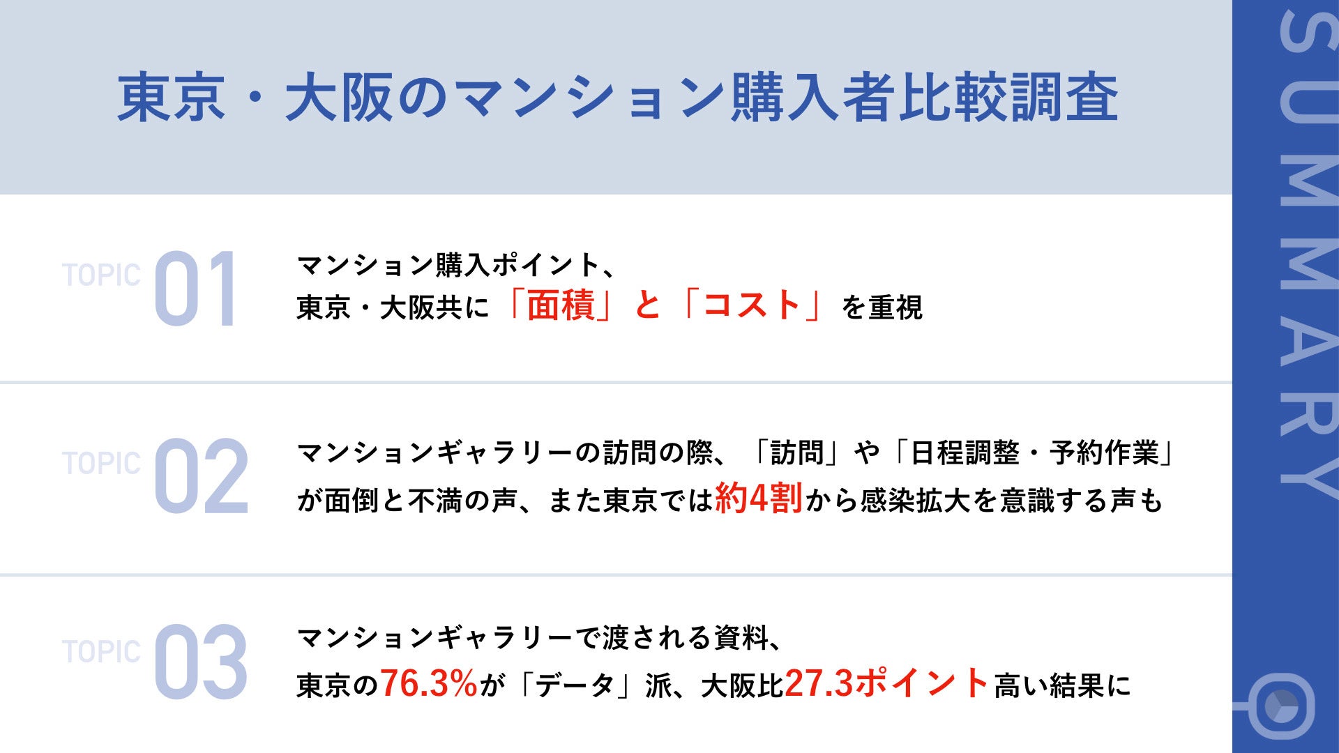 住宅の3Dコミュニケーションプラットフォーム『ROOV(https://roov.jp/)』(※)を開発・提供する株式会社スタイルポート(本社:東京都渋谷区、代表:間所 暁彦、以下スタイルポート)は、コロナ禍で居住用の新築マンションを購入した東京都住在の男女114名、大阪府住在の男女102名に対し、東京・大阪のマンション購入者比較調査を実施しました。