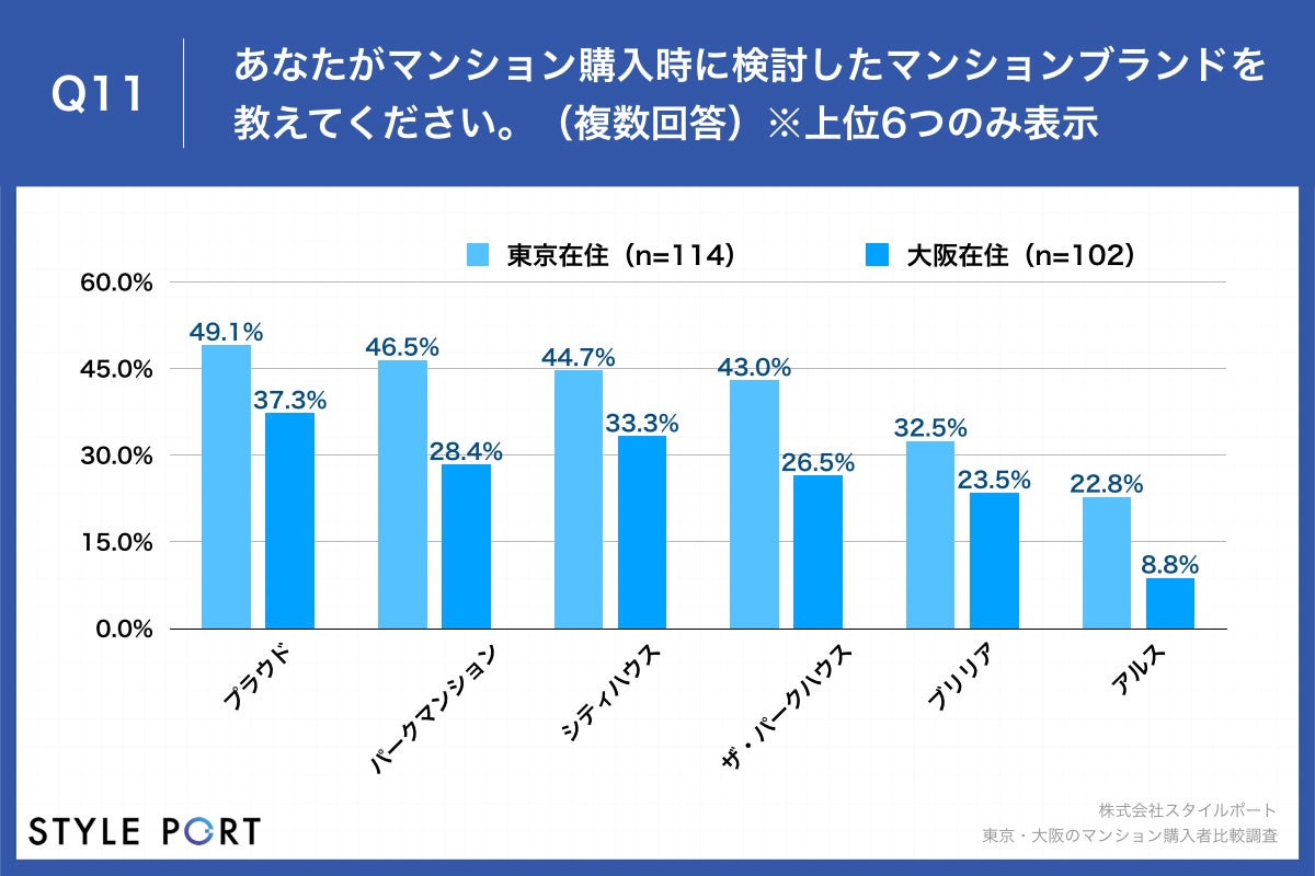 - 購入検討したマンションブランド、東京・大阪両方の地域で「プラウド」が最多