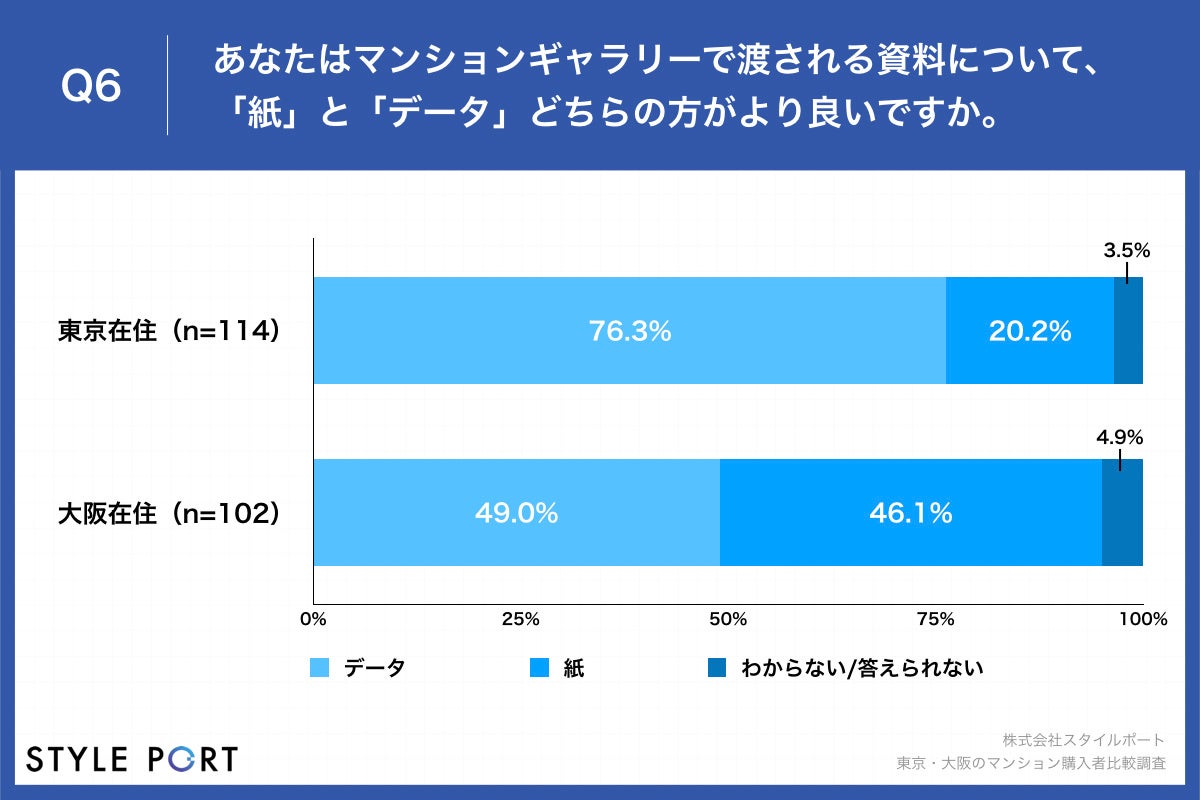 【マンション購入ポイント、東京・大阪共に「面積」と「コスト」を重視】マンションギャラリーで渡される資料、東京の76.3%が「データ」派、大阪比27.3ポイント高