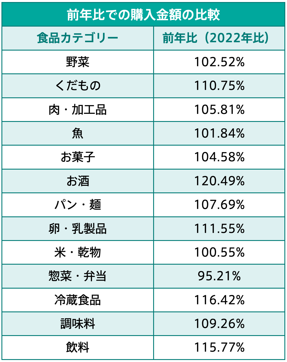 ・買い物金額の上昇が特に顕著だった食品カテゴリーは「お酒、卵・乳製品、飲料」で、物価上昇の影響を特に受けていることが分かりました。