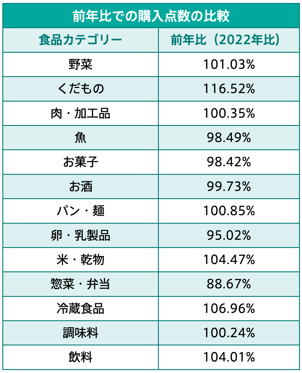 ・購買点数が落ちた食品カテゴリーは「卵・乳製品、惣菜・弁当」で、買い控えされていることが分かりました。